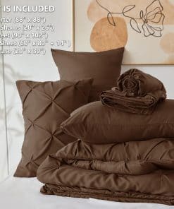 El Edredón CozyLux en color marrón para cama Queen Size de 7 piezas es el complemento perfecto para tu dormitorio. Con un diseño elegante de pliegues que crea patrones geométricos exquisitos, este set de ropa de cama aporta un toque moderno y noble a tu espacio. La tela de microfibra premium es transpirable y absorbente del sudor, mientras que el relleno de microfibra alternativa al plumón es extremadamente suave y agradable para aquellos con alergias al plumón. La sábana ajustable con bolsillo elástico profundo se adapta a colchones de hasta 16″ de profundidad, manteniéndose en su lugar sin deslizarse. El edredón presenta acolchado duradero en forma de cuadros que ofrece un aspecto sofisticado y mantiene el relleno estable en su interior. El set incluye 1 edredón 88″x88″, 2 fundas de almohada 20″x26″, 1 sábana plana 90″x102″ , 2 fundas de almohada 20″x30″. Empacado en una bolsa al vacío, puedes secarlo a calor bajo o sacudirlo suavemente al sol para que vuelva a esponjarse. Lavable a máquina para facilitar su cuidado, se recomienda lavar en ciclo suave con agua fría y secar al sol o a baja potencia para mantener la suavidad y prevenir la formación de bolitas. ¡Déjate envolver por la comodidad y el estilo de CozyLux con este set de edredón para Queen Size!