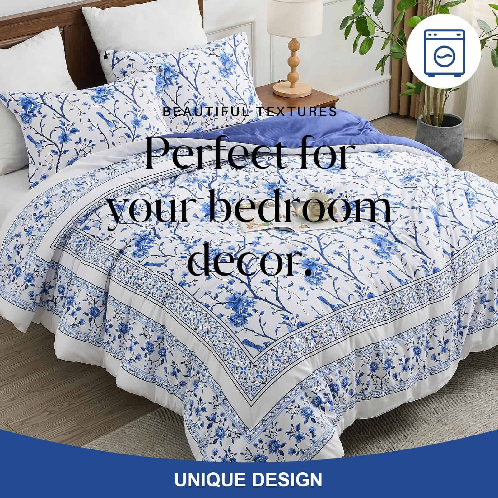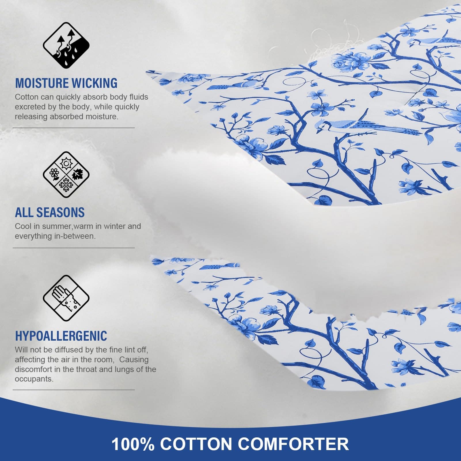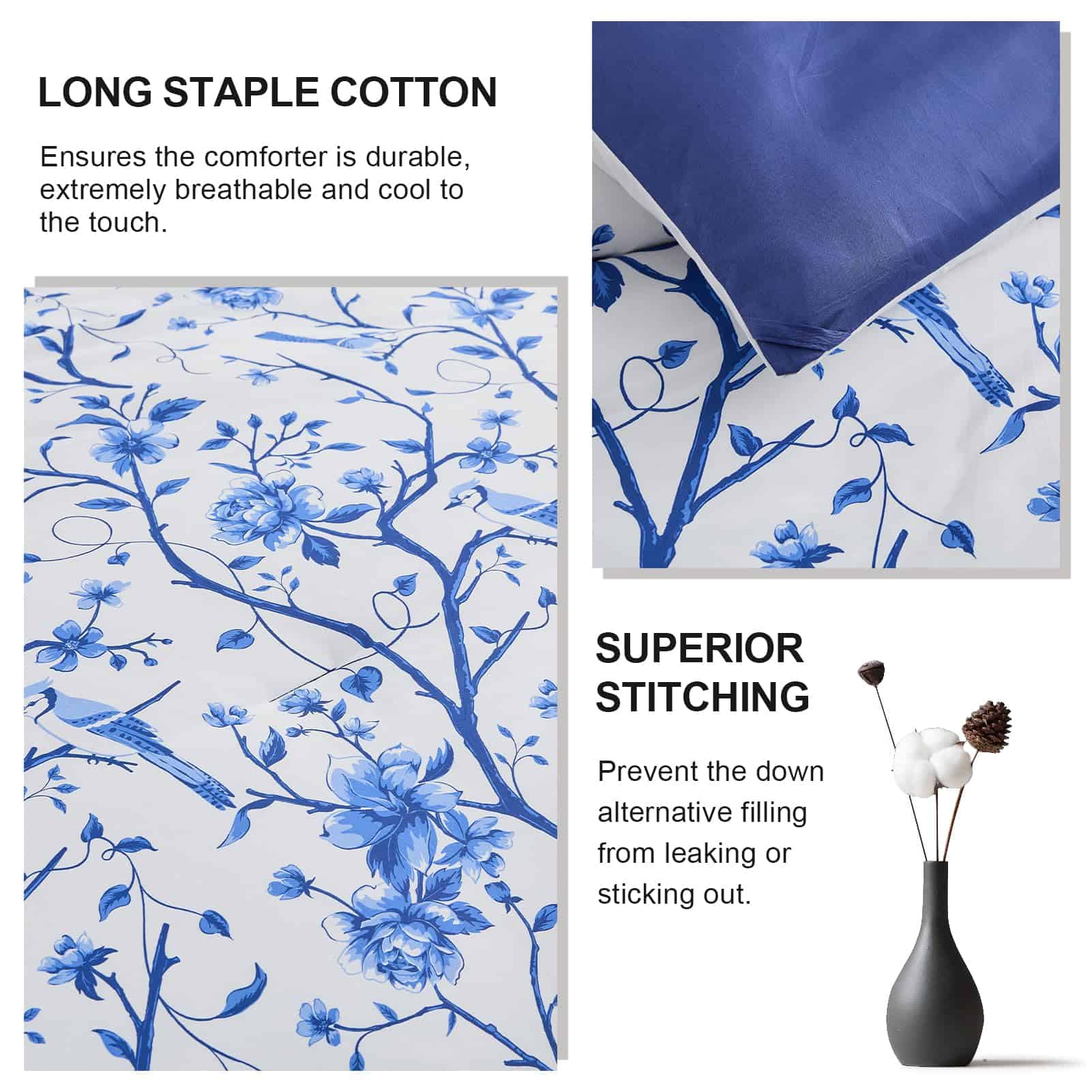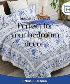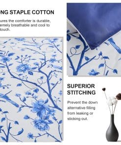 A diferencia del algodón ordinario, este set de edredón FineStichery Queen Size está hecho de algodón de fibra larga de primera calidad con 400 hilos, una tela más transpirable y suave que es un verdadero beneficio para aquellos que sufren de sudoración durante la noche. Experimenta la incomparable esponjosidad de nuestro relleno hipoalergénico de plumón alternativo, que proporciona una calidez suave y acogedora. El set de edredón presenta un elegante estampado de flores y ramas donde está enmarcado por un intrincado borde doble piezas en los bordes exteriores. Con una paleta de colores blanca y azul en todo, este set de ropa de cama de algodón complementará cualquier decoración del hogar, exudando un estilo de granja moderna para un toque clásico y romántico en el dormitorio. Diseñado con un rendimiento en mente, el relleno acolchado está cosido de forma segura para evitar el movimiento y garantizar durabilidad, para que puedas disfrutar de confort durante todo el año – cálido en invierno y ligero en verano. Ideal para habitaciones, habitaciones principales, habitaciones de invitados, hoteles, campamentos y autocaravanas. El Set de Ropa de Cama Queen incluye 1 edredón (90″x90″), el set viene con dos fundas de almohada a juego (20″x26″) para completar el look. Como el edredón está sellado al vacío, se recomienda golpearlo suavemente varias veces para restaurar la esponjosidad después de unas horas. El mantenimiento es muy fácil, simplemente lavar a máquina en agua fría. No usar lejía. Retirar rápidamente y usar una plancha de vapor si es necesario para una restauración como nueva. Duerme tranquilo sabiendo que nuestro esponjoso edredón está certificado por OEKO-TEX, garantizando un entorno de sueño saludable y seguro. Transforma tus noches en un santuario de confort y estilo!