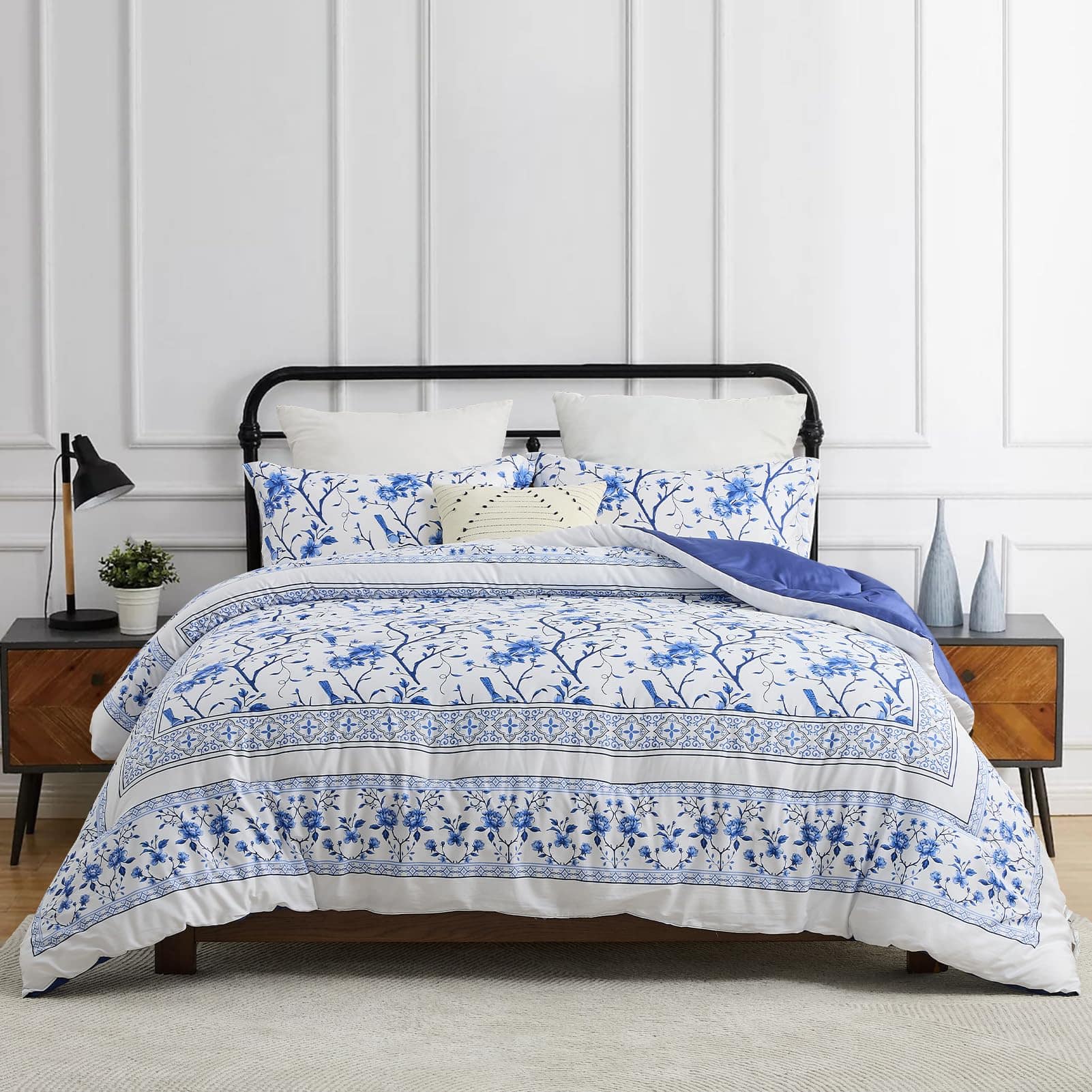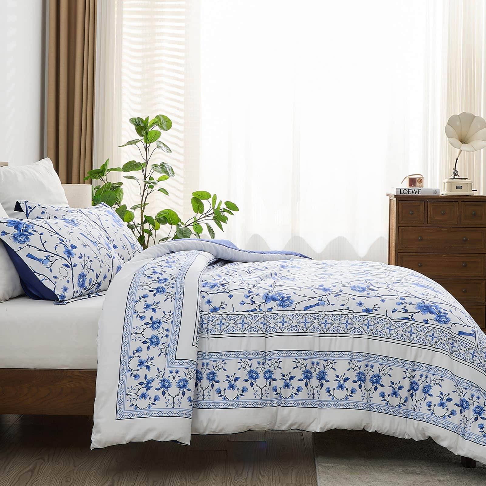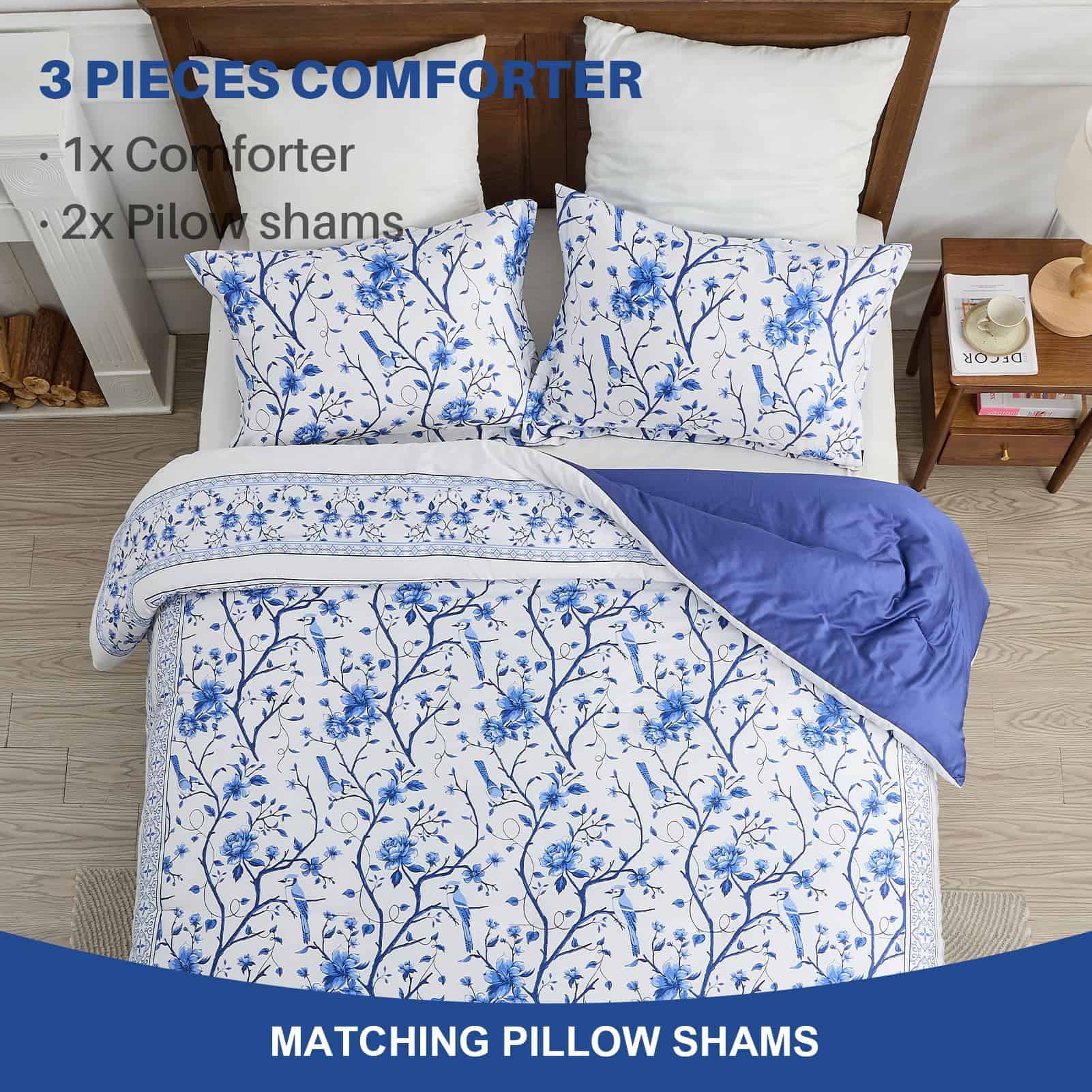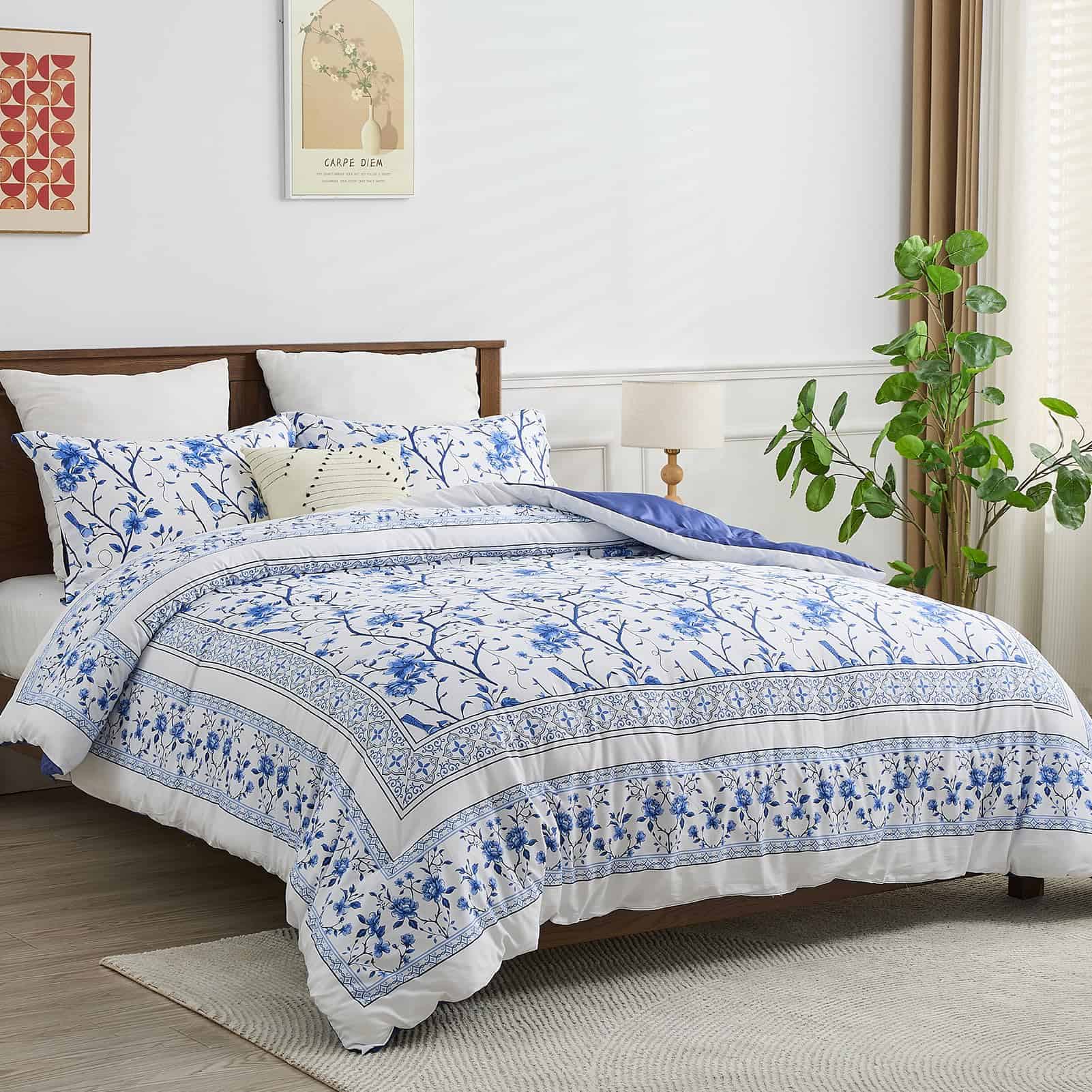 A diferencia del algodón ordinario, este set de edredón FineStichery Queen Size está hecho de algodón de fibra larga de primera calidad con 400 hilos, una tela más transpirable y suave que es un verdadero beneficio para aquellos que sufren de sudoración durante la noche. Experimenta la incomparable esponjosidad de nuestro relleno hipoalergénico de plumón alternativo, que proporciona una calidez suave y acogedora. El set de edredón presenta un elegante estampado de flores y ramas donde está enmarcado por un intrincado borde doble piezas en los bordes exteriores. Con una paleta de colores blanca y azul en todo, este set de ropa de cama de algodón complementará cualquier decoración del hogar, exudando un estilo de granja moderna para un toque clásico y romántico en el dormitorio. Diseñado con un rendimiento en mente, el relleno acolchado está cosido de forma segura para evitar el movimiento y garantizar durabilidad, para que puedas disfrutar de confort durante todo el año – cálido en invierno y ligero en verano. Ideal para habitaciones, habitaciones principales, habitaciones de invitados, hoteles, campamentos y autocaravanas. El Set de Ropa de Cama Queen incluye 1 edredón (90″x90″), el set viene con dos fundas de almohada a juego (20″x26″) para completar el look. Como el edredón está sellado al vacío, se recomienda golpearlo suavemente varias veces para restaurar la esponjosidad después de unas horas. El mantenimiento es muy fácil, simplemente lavar a máquina en agua fría. No usar lejía. Retirar rápidamente y usar una plancha de vapor si es necesario para una restauración como nueva. Duerme tranquilo sabiendo que nuestro esponjoso edredón está certificado por OEKO-TEX, garantizando un entorno de sueño saludable y seguro. Transforma tus noches en un santuario de confort y estilo!