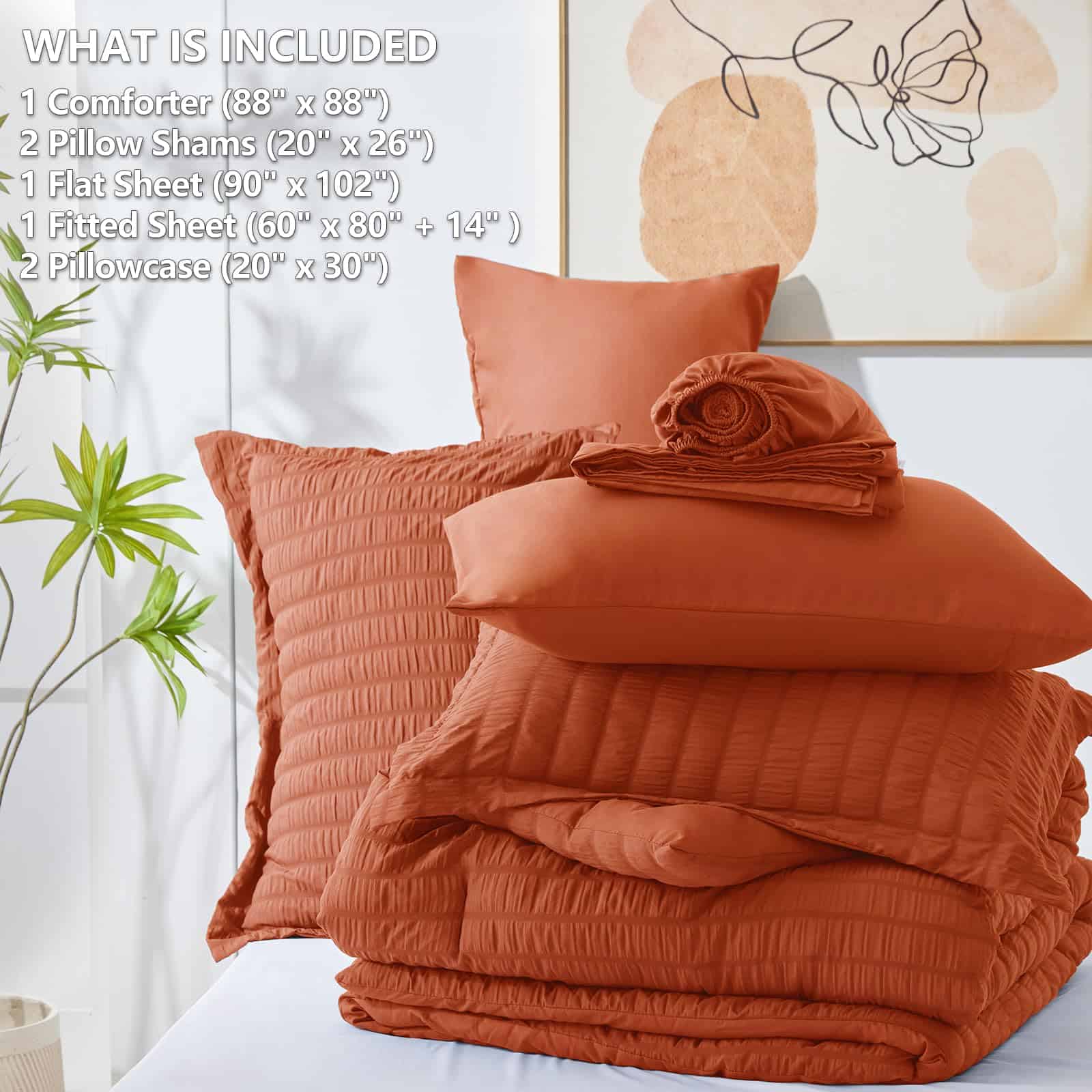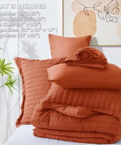 El set de ropa de cama tamaño Queen de 7 piezas incluye – 1 Edredón (88″ x 88″) + 2 Fundas de almohada (20″ x 26″) + 2 Fundas de almohada(20″ x 30″) + 1 Sábana plana(90″ x 102″) + 1 Sábana ajustable(60″ x 80″) – Nuestro juego de cama viene empaquetado en una bolsa al vacío, por lo que puedes secarlo a baja temperatura o golpear suavemente el edredón mientras lo expones al sol para que vuelva a ser mullido. Las sábanas son lavables a máquina, lo que te puede ahorrar tiempo y energía.