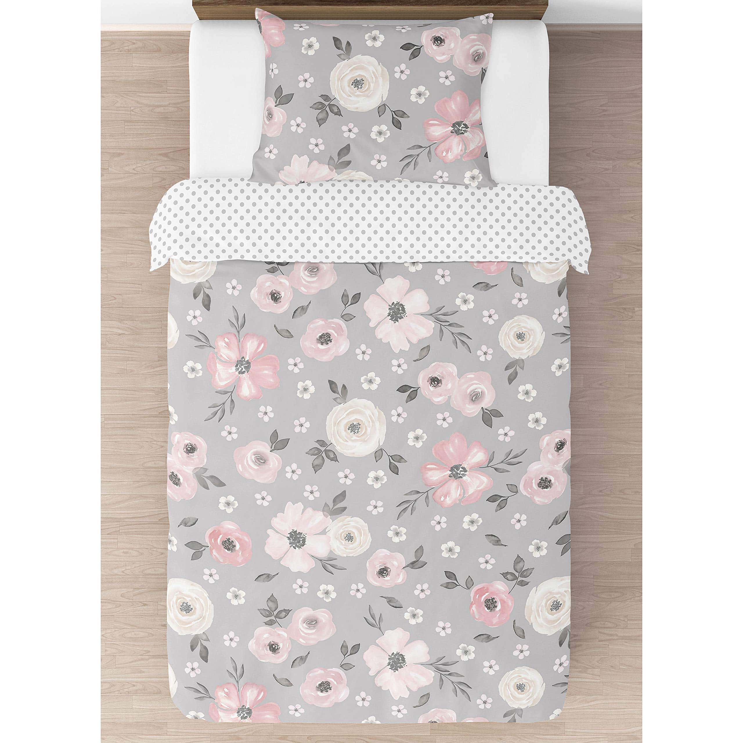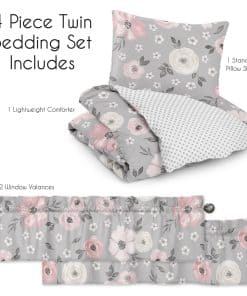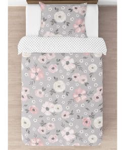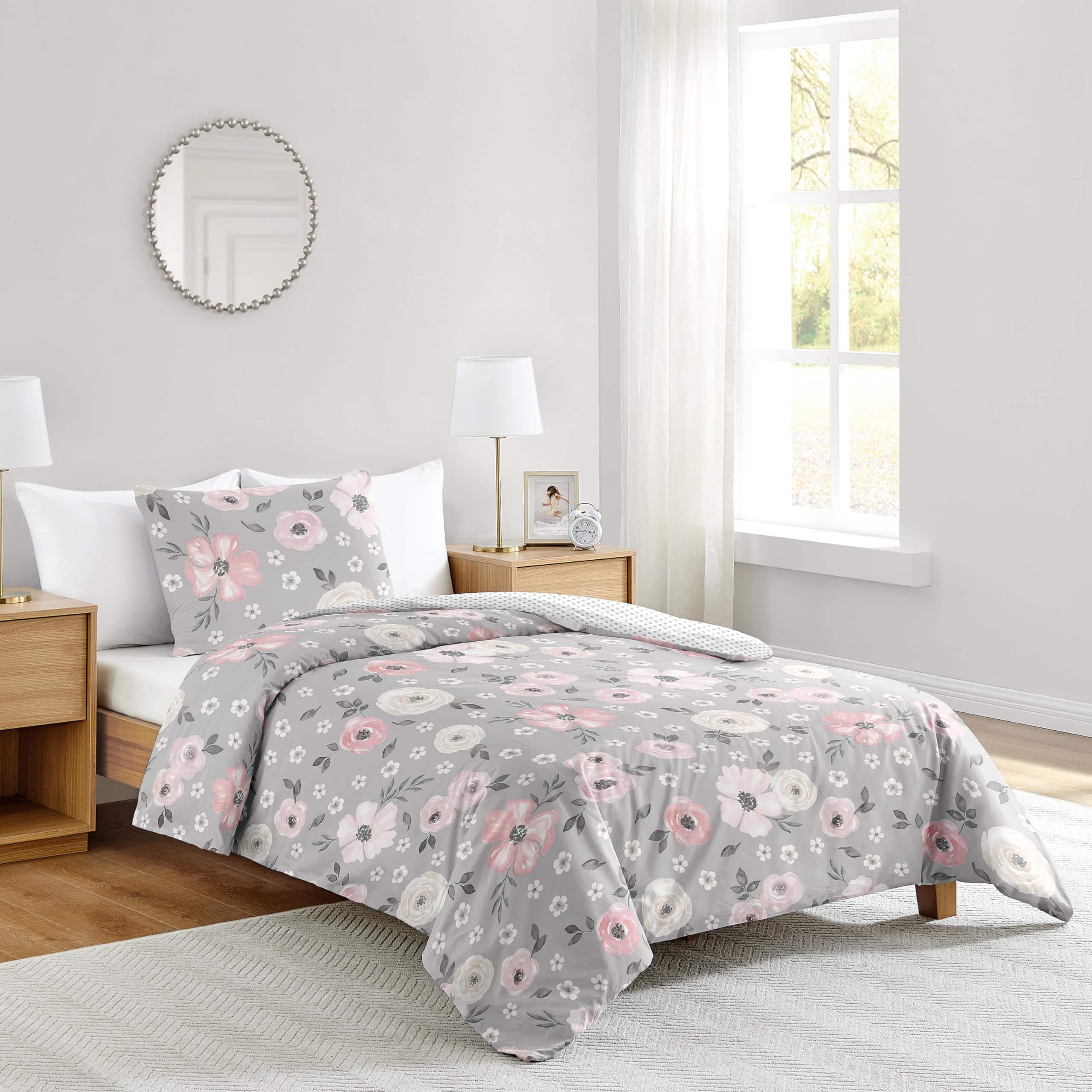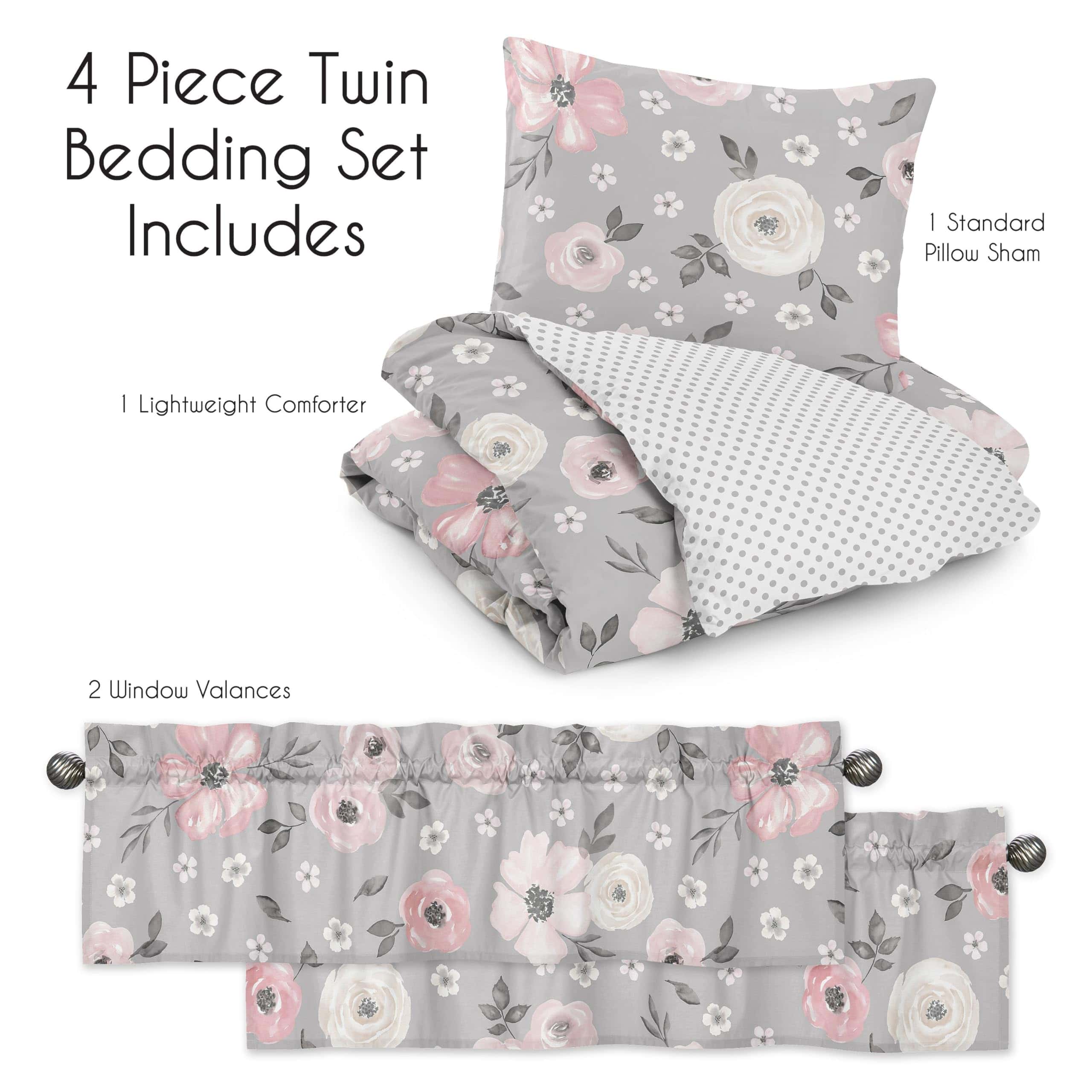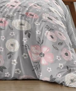 Este set cuenta con un exclusivo estampado de flores pintadas a mano en acuarela y un mini lunares grises. Está hecho de tela de microfibra cepillada y es lavable a máquina. Secar en ciclo suave. Este diseño tiene accesorios a juego como tratamientos para ventanas, cestos de ropa, cortinas de baño y cojines.
