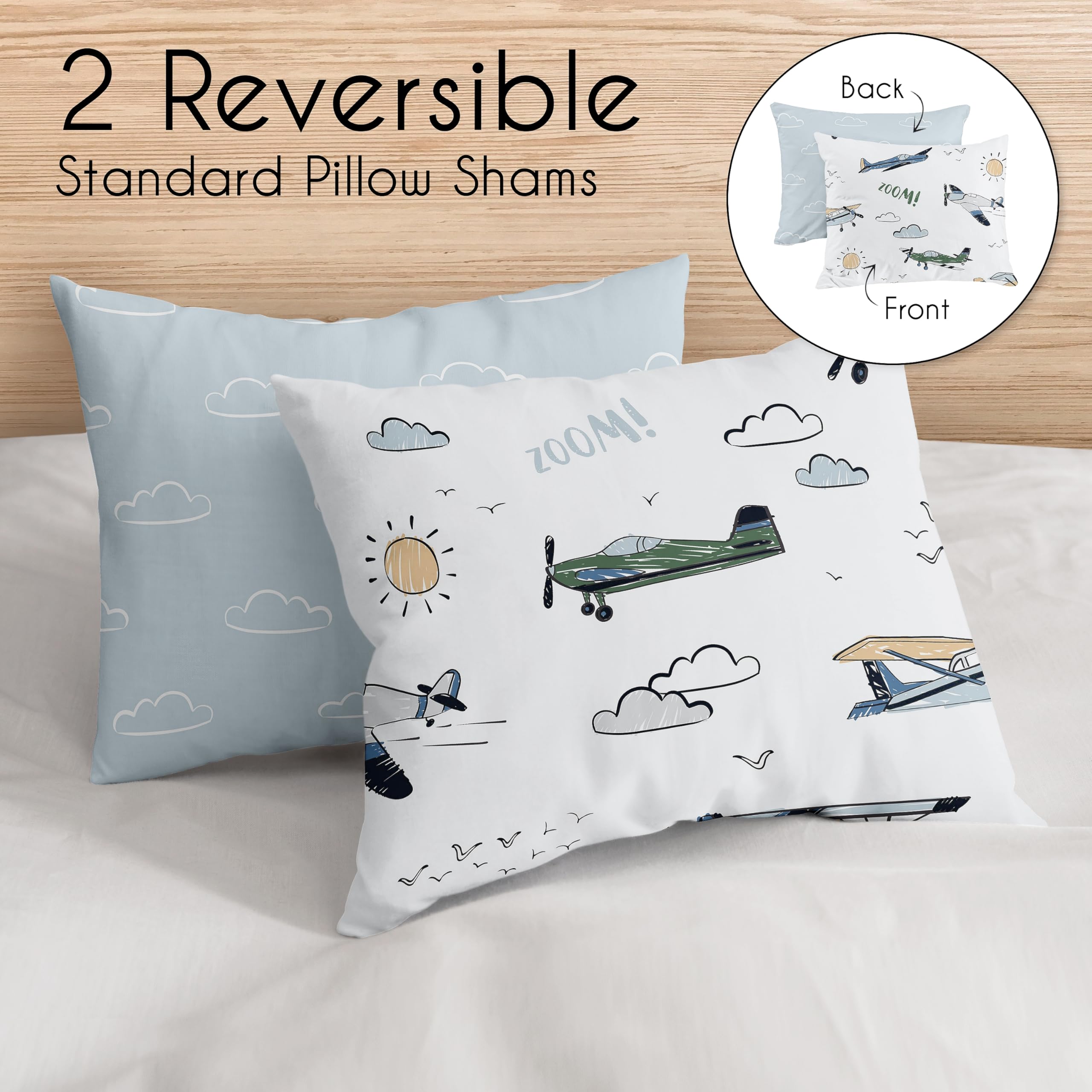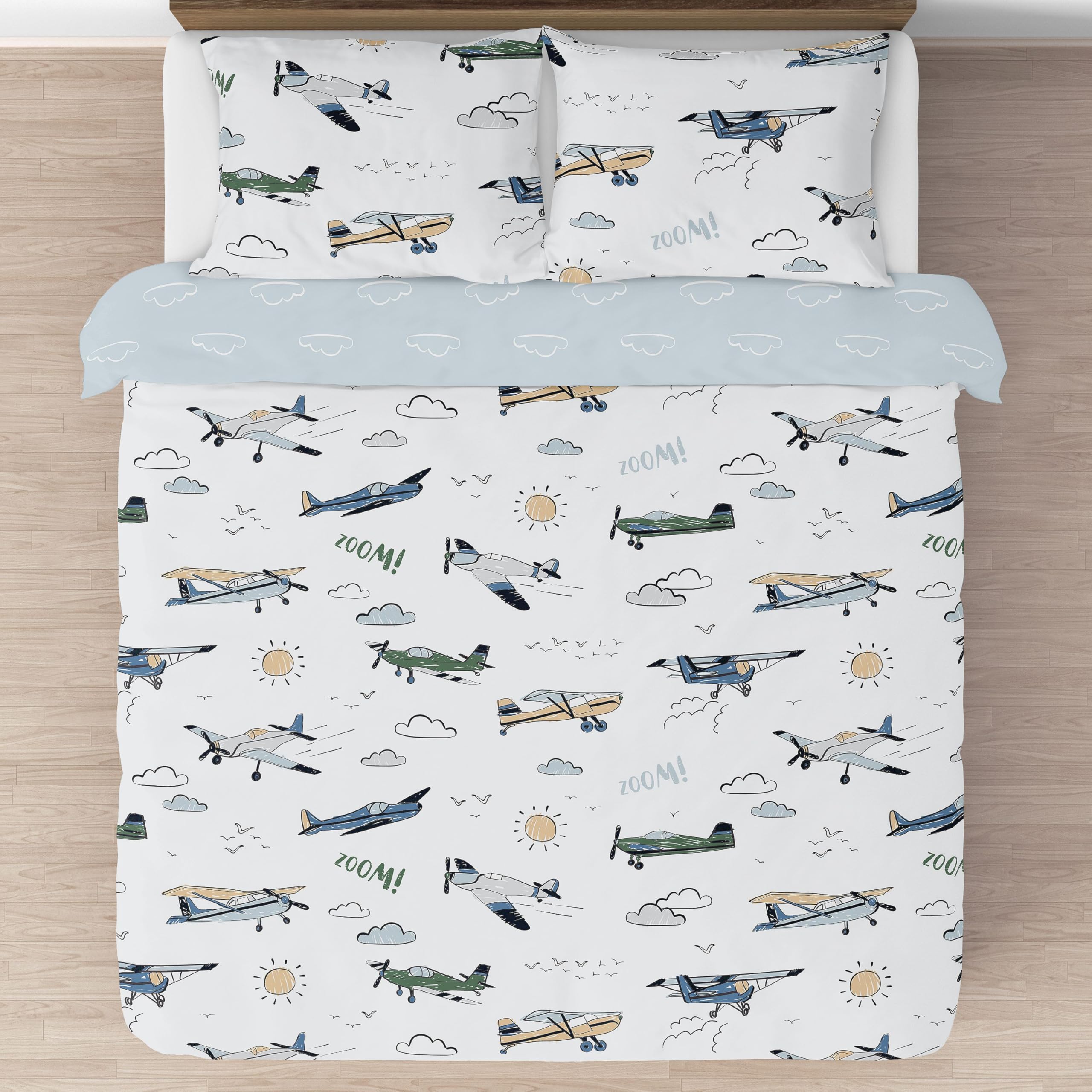 Este set de edredón Sweet Jojo Designs Vintage Airplane aportará un toque de aventura y diversión a la habitación de su hijo. El patrón detallado de aviones vintage en tonos de gris, amarillo, verde, gris, blanco y azul sobre un fondo de cielo azul y nubes seguramente capturará la imaginación de los pequeños aventureros. El juego de 3 piezas incluye un edredón ligero de tamaño Full/Queen y 2 fundas de almohada estándar, todo elaborado con suave microfibra cepillada para un confort máximo. Además, este set es lavable a máquina para facilitar su cuidado. Añada un toque de color y diversión a la habitación de su hijo con este set de edredón de aviones vintage.