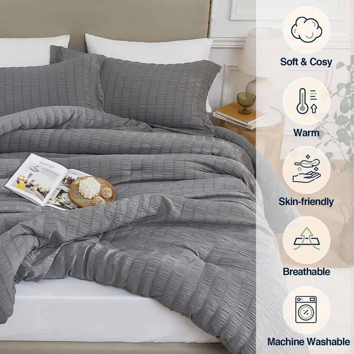 1. Comodidad & Suavidad: Nuestro set de edredones gris de 3 piezas está hecho de material 100% poliéster lavado que es suave, cómodo y duradero. Con un equilibrio perfecto entre peso y calidez, este edredón es transpirable y amigable con la piel sin agobiar tu cuerpo. Te permite relajarte con un tacto suave como las nubes y dejar el cansancio del día en dulces sueños.