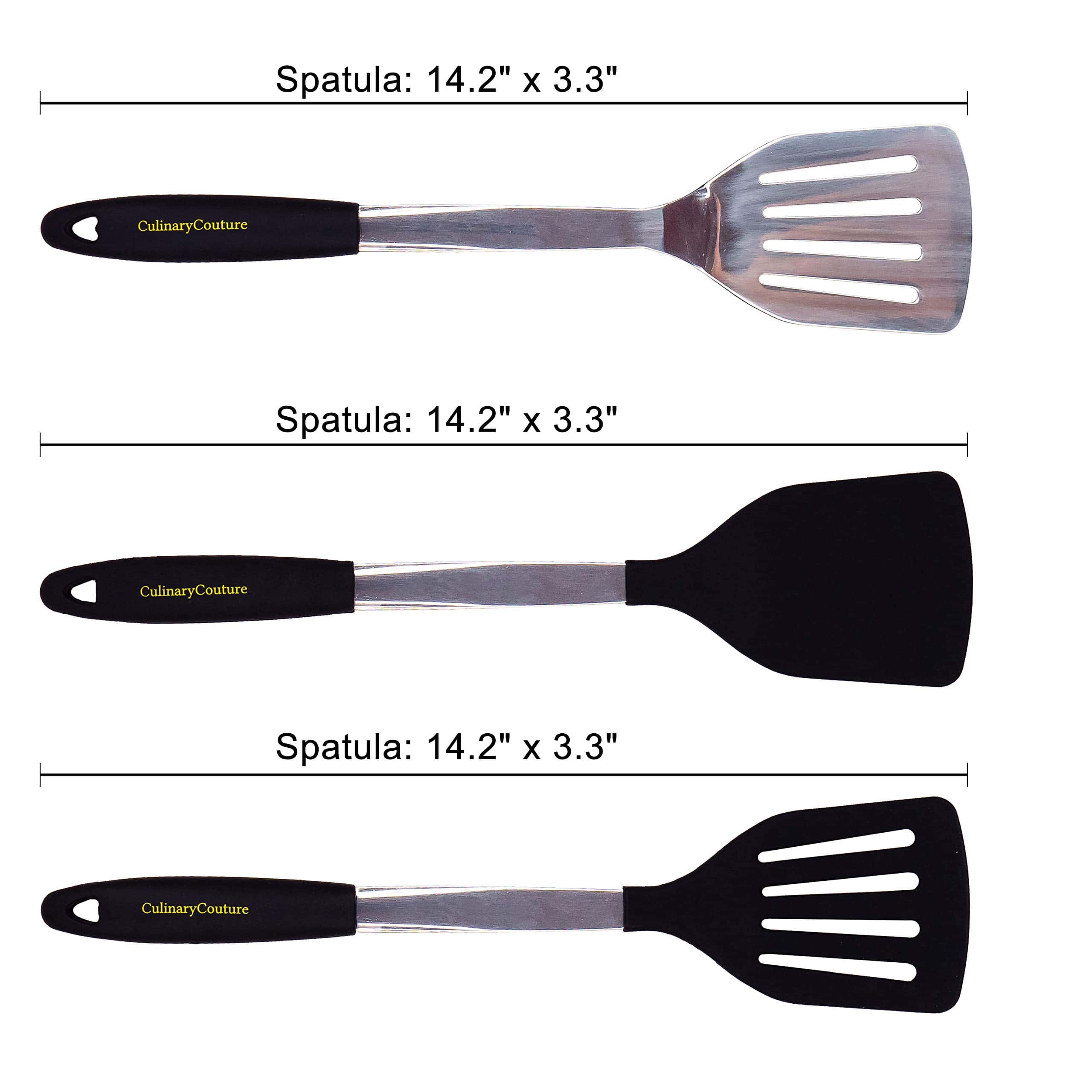Este set de espátulas de acero inoxidable en color rojo es perfecto para su uso en la cocina, BBQ o parrilla. El conjunto incluye una espátula ranurada, un volteador de silicona y una espátula metálica, todos diseñados para resistir el calor. Con estos utensilios, puede cocinar y girar alimentos fácilmente, asegurando un resultado perfecto en cada ocasión. ¡Agregue este set a su colección de utensilios de cocina!
