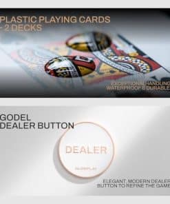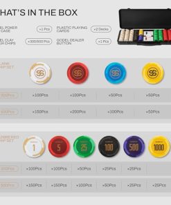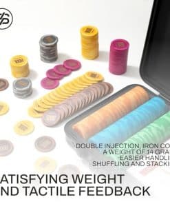 La colección Godel encarna el diseño definitivo de la simplicidad contemporánea. El diseño simétrico de patrón geométrico permanece minimalista y elegante, mientras se combina con colores brillantes y vivos que suman un toque lúdico al estilo. Gracias al núcleo de hierro inyectado doble y un peso de 14 gramos, cada ficha está bien equilibrada, lo que permite a los jugadores disfrutar de un buen peso y tacto. Cada ficha de póker de arcilla mide 40 mm y está diseñada con un ligero acabado mate que permite que las fichas se apilen y se barajen sin deslizarse. Ya sea barajadas, apiladas o agregadas al bote, el sonido completo y nítido te permite disfrutar de cada proceso del juego. El suave y completo tacto de las fichas de póker proporciona la máxima satisfacción. El estuche de fichas está construido con durabilidad extrema y no se deformará fácilmente, brindando protección total para tu equipamiento. La carcasa está hecha de material alemán Bayer PC y diseñada a partir de una sola inyección moldeada. También cuenta con un marco de aleación de aluminio de la serie 6 de grado aeronáutico y un soporte interno que está construido con material compuesto ultraligero de grado automovilístico. Súper portátil con diseño negro de cuerpo completo y efecto espejo que es estéticamente agradable. El juego de 300 fichas incluye: 100 blancas, 100 rojas, 50 azules, 50 amarillas. El diámetro de cada ficha es de 40 mm. Todos los juegos de póker incluyen: 2 barajas de cartas de plástico SLOWPLAY y 1 repartidor. (No proporcionamos botón de ciega pequeña ni de ciega grande).
