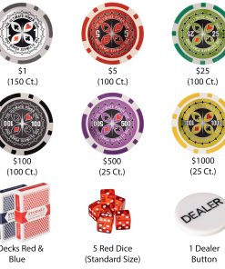 También ofrecemos varios estuches de actualización premium, incluido un estuche de fichas de póker rodante de 1000 fichas, un estuche de fichas de póker de aluminio negro de 500 fichas de lujo con un interior de terciopelo rojo, y un estuche de aluminio de primera calidad de 500 fichas que incluye bandejas de fichas acrílicas extraíbles.