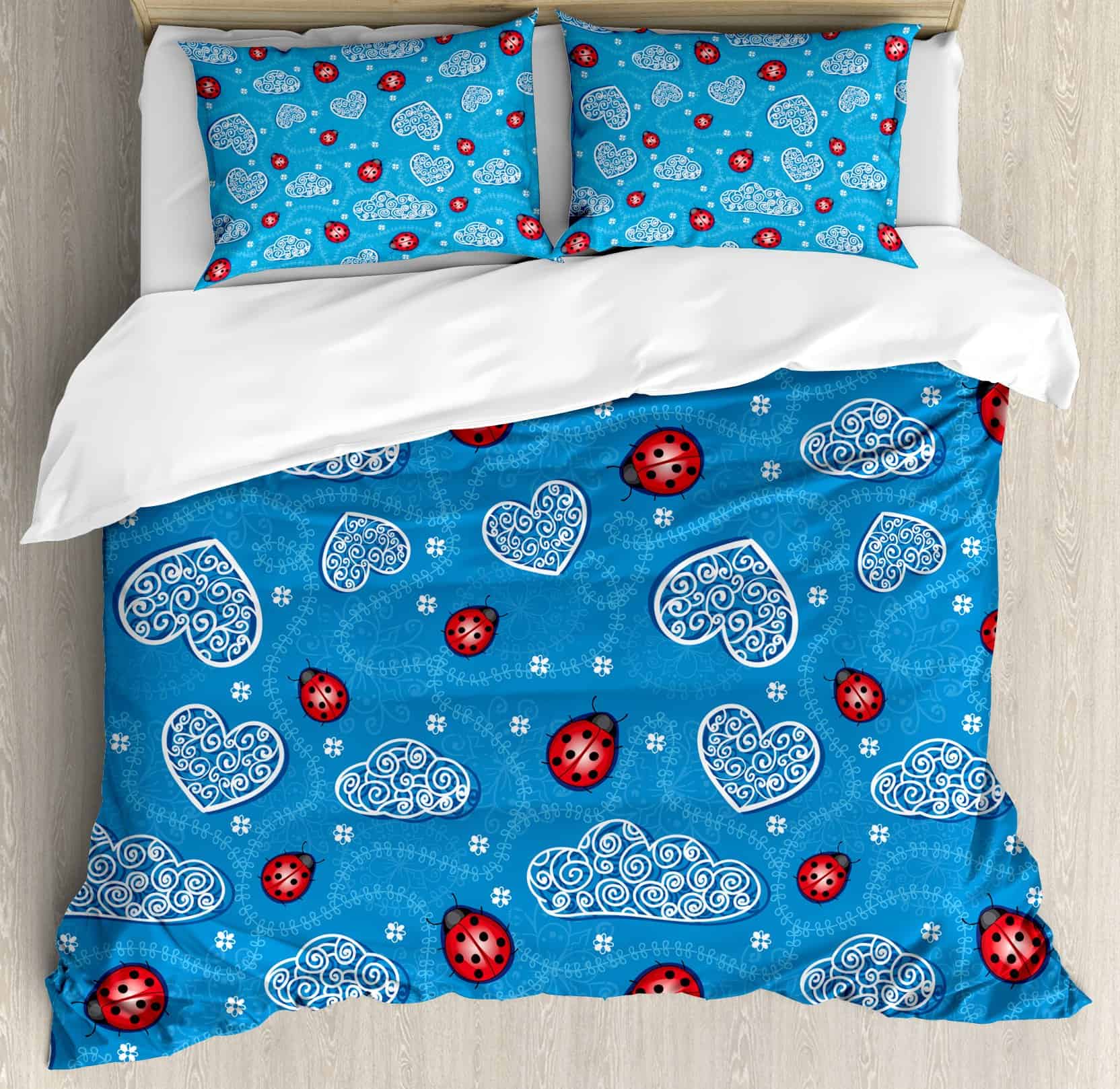 Este juego de ropa de cama incluye una funda de edredón queen y 2 fundas de almohada a juego, todo con un diseño encantador de mariquitas y nubes adornadas. Fabricado con tela de microfibra cepillada 100%, la ropa de cama es increíblemente suave al tacto y ofrece un confort supremo. Los colores son vibrantes y la imagen en el diseño se destaca con claridad.