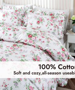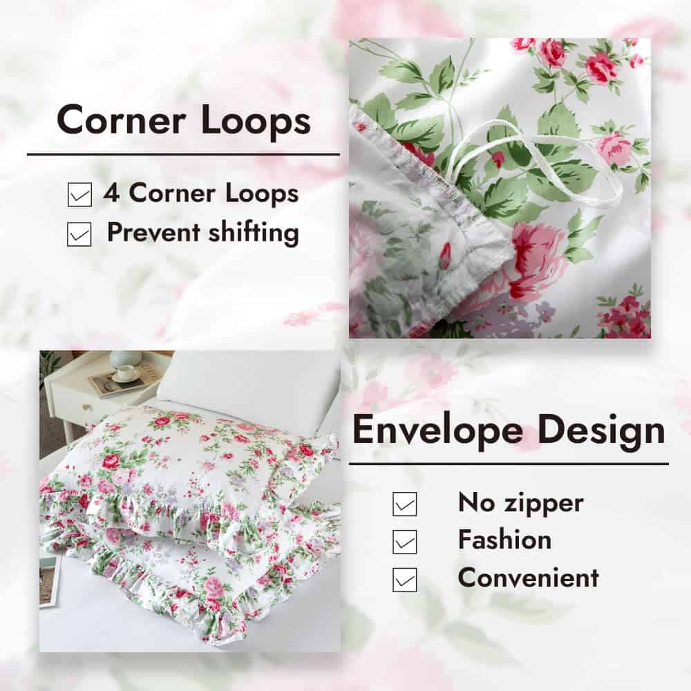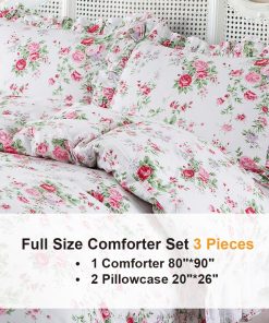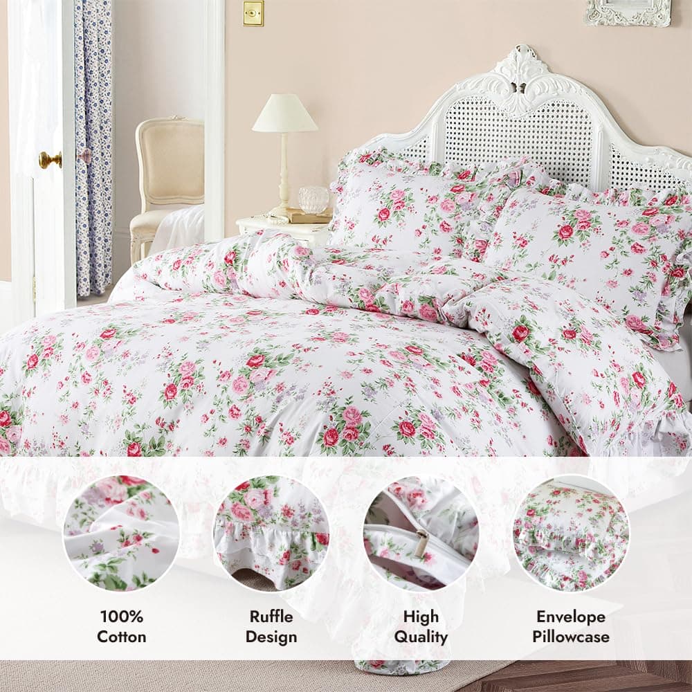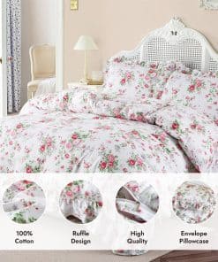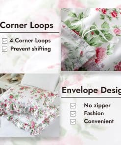 1. Material de Algodón Ultra Suave 100% algodón, tacto ultra suave con arrugas naturales. Transpirable y duradero. Sin decoloración ni encogimiento. Debido a que el ancho de la tela es solo de 59 pulgadas, habrá costuras en ambos lados de la funda de edredón. 2. Aspecto Vintage Rústico y de Volantes Diseño de 2 capas de volantes y estampado de rosa vintage y desgastada harán que tu cama tenga un aspecto de granja. Shabby y chic. 3. Juego de Queen de 3 Piezas Incluye 1 funda de edredón: 80×90 pulgadas. 2 fundas de almohada: 20×26 pulgadas (No incluye edredón ni relleno para almohadas). La funda de edredón tiene cierre de cremallera y las fundas de almohada tienen cierre de sobre. 4. Cuidado Fácil Lavable a máquina. Lavar a máquina en frío por separado. Planchar a baja temperatura. No usar lejía. Lavar antes de usar por primera vez. La tela de algodón se arrugará después de lavarla, simplemente planche o use vapor en medio y todo volverá a ser hermoso. La tela se irá suavizando cada vez más después de cada lavado. 5. Gran Idea de Regalo Bueno para regalar en el Día de Acción de Gracias, Navidad, Año Nuevo. También es un buen regalo para bodas. Cambia el aspecto de tu casa. Si necesitas una falda de cama a juego, no dudes en contactarnos.