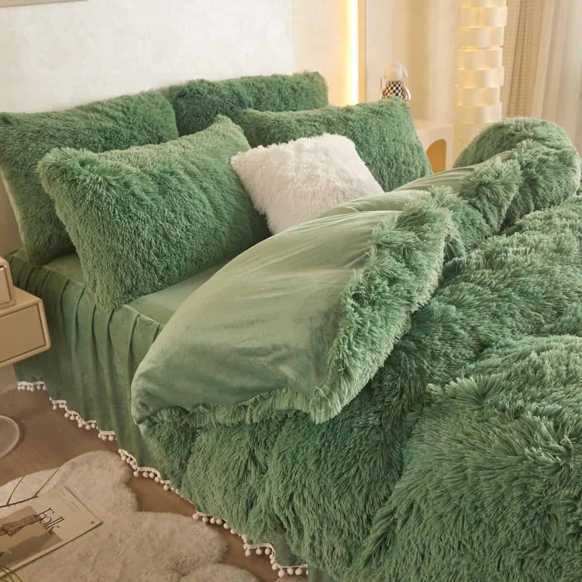 1. Puedes obtener este set de funda de edredón verde salvia king que incluye 1 Funda de Edredón de Piel Sintética de 90″x 104″ pulgadas. Ten en cuenta que este set no incluye fundas de almohada de piel sintética verde salvia, si las necesitas, puedes entrar en nuestra tienda principal para comprar fundas de almohada de piel sintética individuales. 2. Con tela suave y esponjosa de peluche, la funda de edredón verde salvia king ofrece un tacto suave y suave como la leche. La funda de edredón esponjosa posee un sistema especial de circulación de calor, que podría retener firmemente el calor y mantener las sábanas cálidas y cómodas, ofreciendo a las personas un sueño suave y constante, especialmente para los durmientes descalzos. 3. Sueño cómodo: La funda de edredón verde salvia king de piel sintética mantendrá una temperatura constante mientras duermes, y no sentirás frío incluso en invierno. La funda de edredón esponjosa tiene cierta capacidad de absorción de humedad. Compra nuestras fundas de almohada de piel sintética verde salvia individuales, con la misma funda de edredón esponjosa de color, puede aportar un color extra para la decoración de tu hogar. 4. Cierre de cremallera: Al acostarte en la cama en invierno, te calentarás rápidamente con el juego de cama esponjoso verde salvia king, lo que te brindará una experiencia de sueño cómoda. El diseño resistente de cierre de cremallera metálica no dañará ni arañará tu piel. El diseño de correa fija en las cuatro esquinas previene eficazmente el movimiento, y el set de ropa de cama de peluche es más conciso y elegante. 5. Servicios y Regalos: El set de cama verde salvia de HAIHUA es un buen regalo para tus amigos en invierno. Ya sea Navidad, San Valentín, cumpleaños o boda, este juego de cama de piel sintética king para mujeres será un regalo perfecto y cómodo. Agradecemos que te encanten nuestros productos como a nuestros otros revisores de 5 estrellas, por eso ofrecemos un servicio de devolución y reemplazo de 30 días. Si tienes alguna pregunta, contáctanos para obtener una solución satisfactoria.