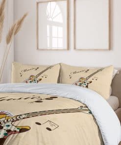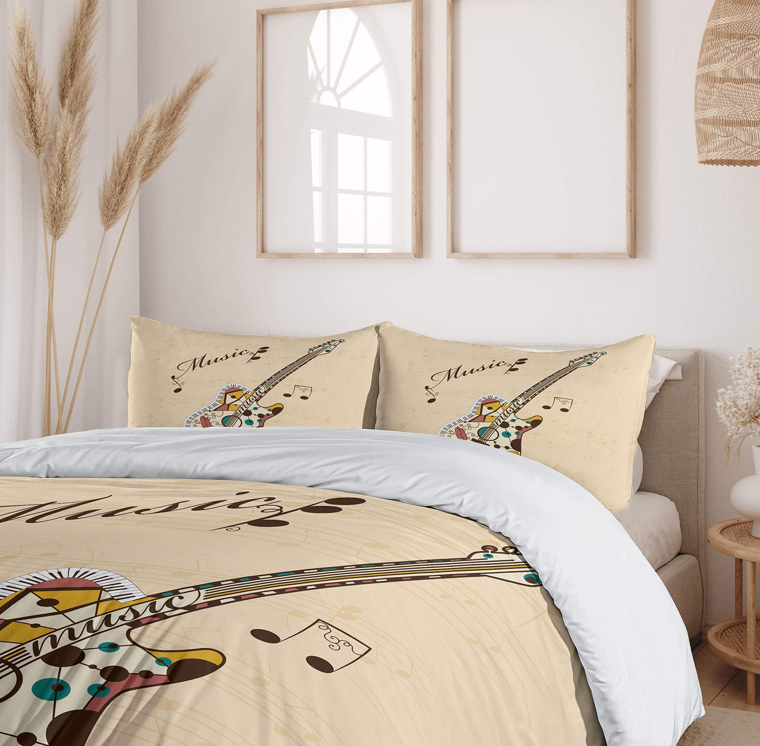 La funda nórdica Ambesonne Guitar presenta un diseño único de guitarra abstracta funky, melodía de instrumento de guitarra, notas musicales y escritura a mano que le dará a tu habitación un toque musical. Este juego de ropa de cama de 3 piezas incluye una funda nórdica king y 2 fundas de almohada, con una donación de parte de las ganancias para ayudar a las víctimas de los recientes terremotos en Turquía. Hecho de tela de microfibra cepillada 100%, es súper suave y cómodo. Con una cremallera oculta en la funda nórdica y cierres de sobre en las fundas de almohada, es fácil de usar. Lavable a máquina y resistente a la decoloración, este set de funda nórdica está impreso con tecnología digital de vanguardia para colores vibrantes y una imagen nítida. Añade estilo y confort a tu habitación con el set de funda nórdica Ambesonne Guitar.