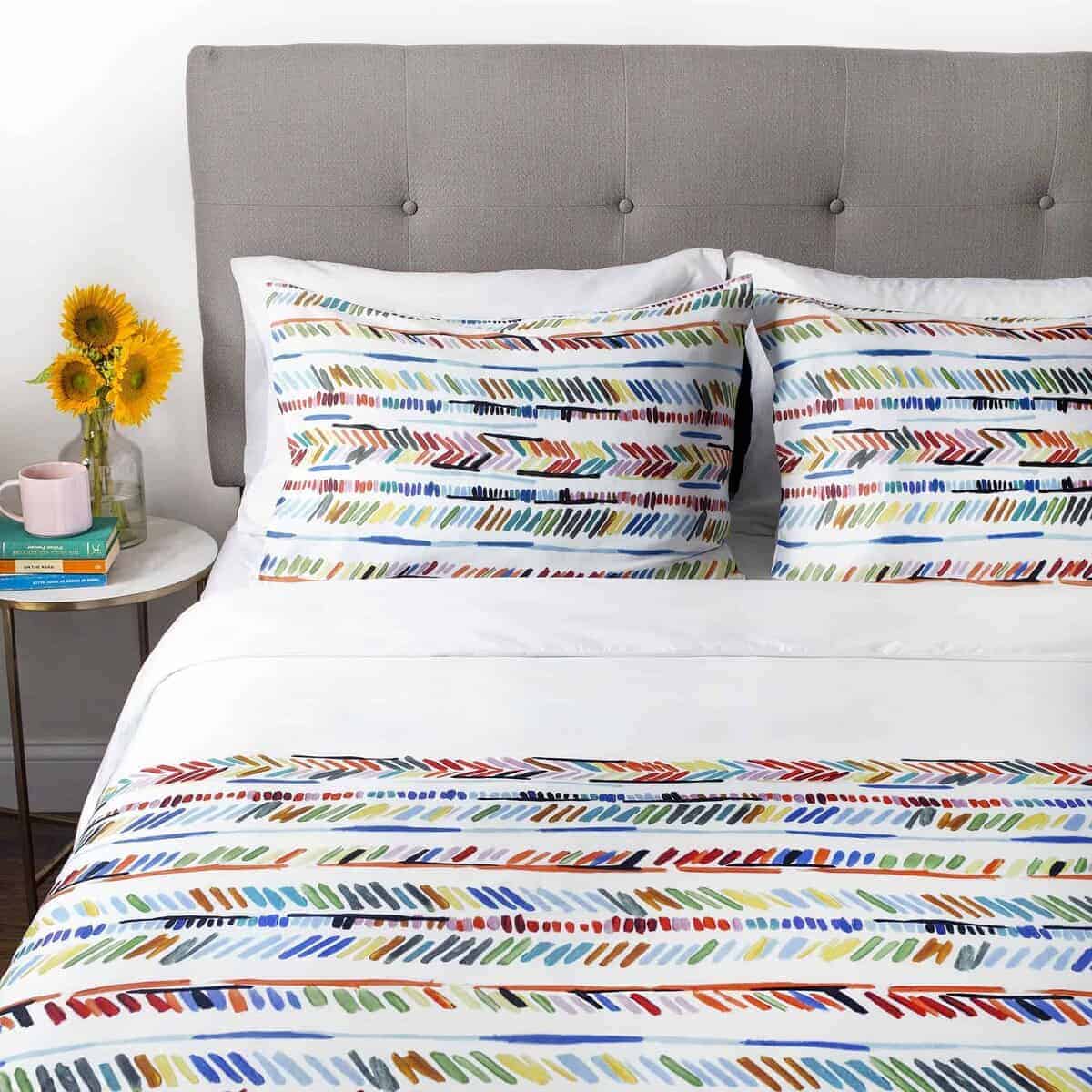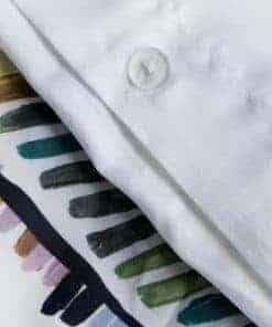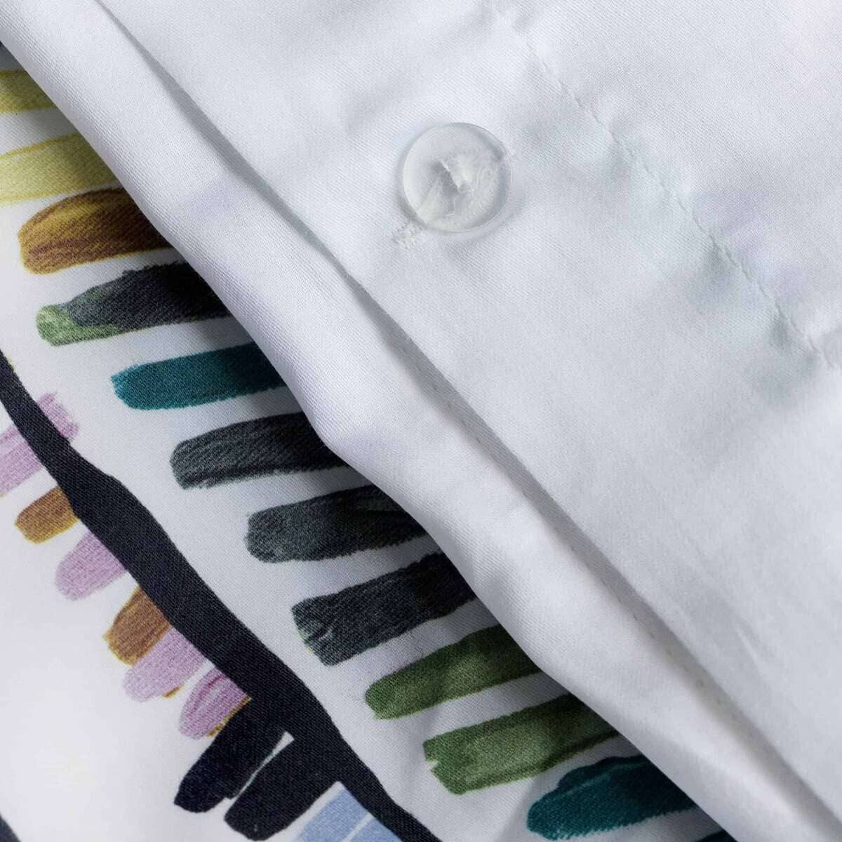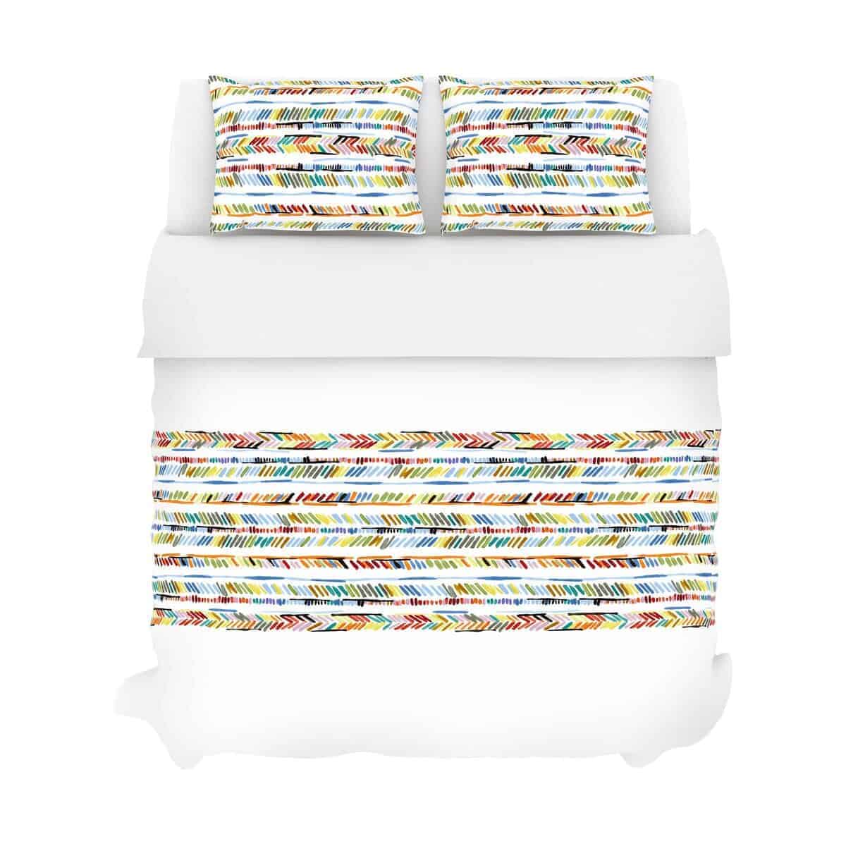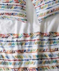 COLORFLY presenta nuestra funda nórdica CROSBY, la cual trae una variación fresca de uno de nuestros diseños más populares. Inspirado en el motivo Prism de Lane, nuestro estudio en Nueva York diseñó una banda colorida de vivas pinceladas entrelazadas, recordando una acogedora manta colorida arrojada sobre una funda nórdica blanca invernal. Las fundas de almohada a juego de Crosby lo atan todo juntas al presentar el mismo motivo de pinceladas entrelazadas debajo. Este set incluye una funda nórdica individual con cierre de botón y una funda de almohada estándar. La funda nórdica individual mide 68″ x 86″ y la funda de almohada estándar mide 21″ x 27″. Instrucciones de cuidado: lavar a máquina en frío, no usar lejía, no usar secadora, no limpiar en seco, planchar a temperatura media. Hecho en España.