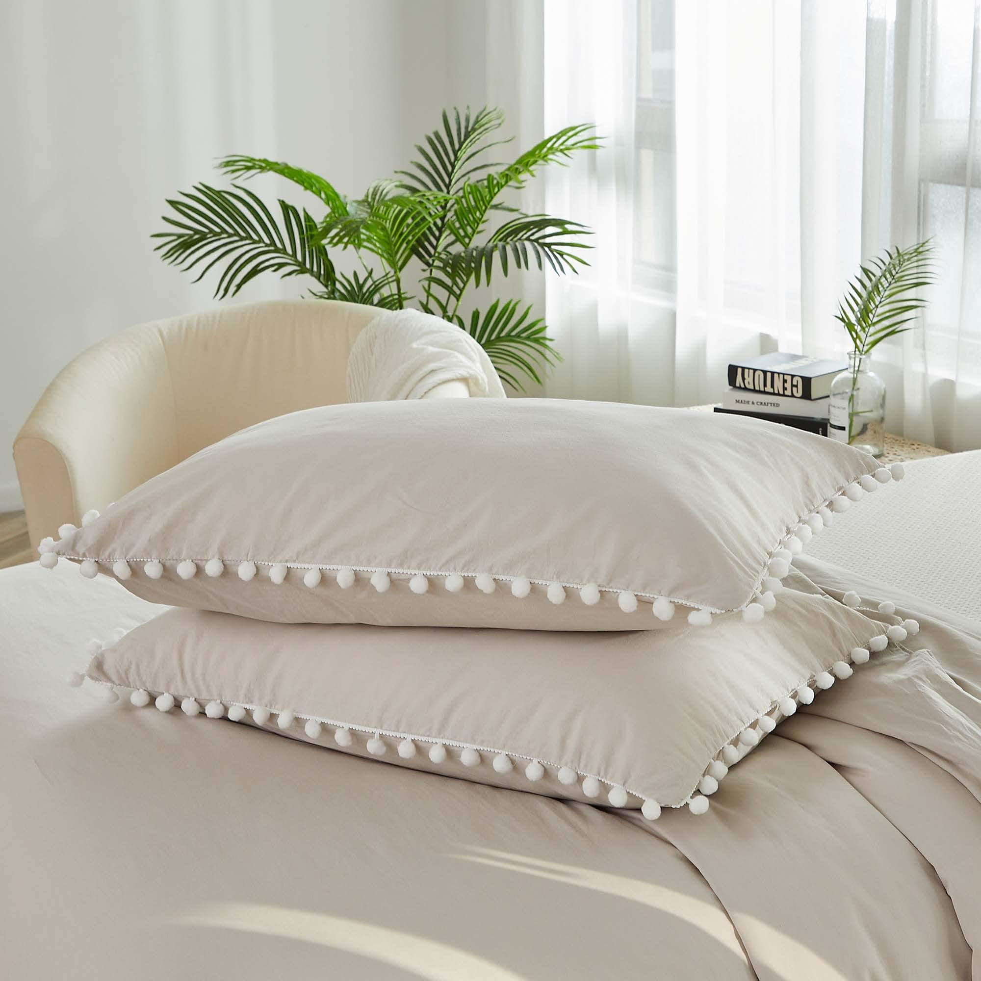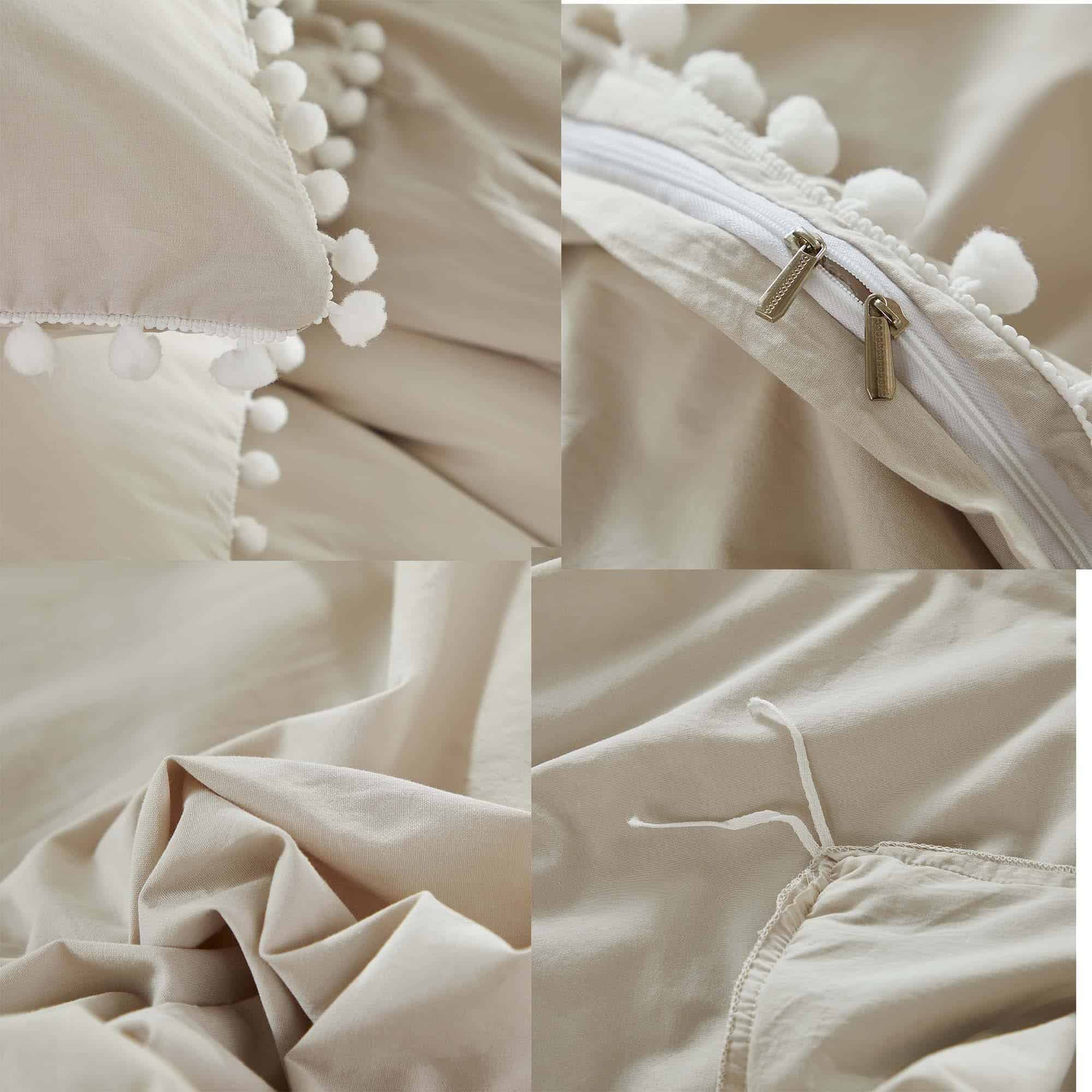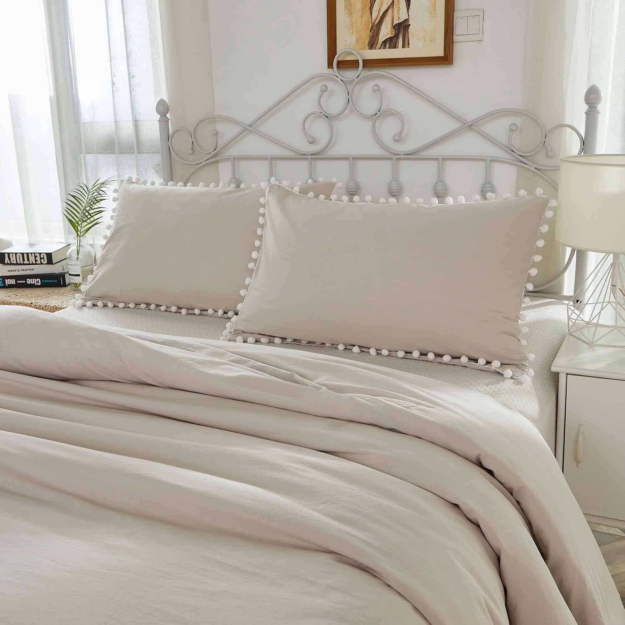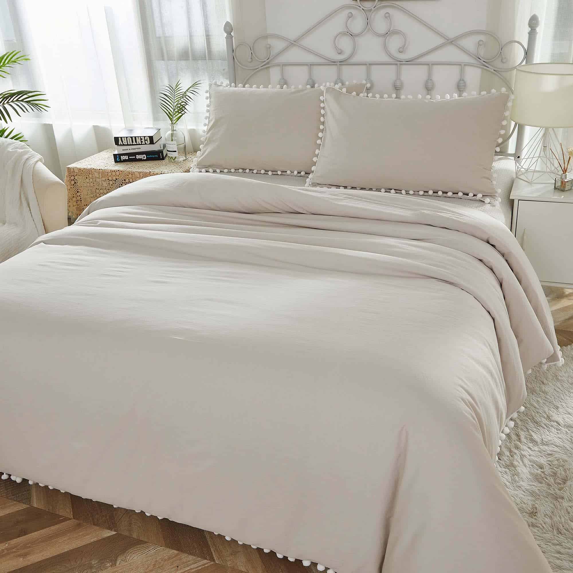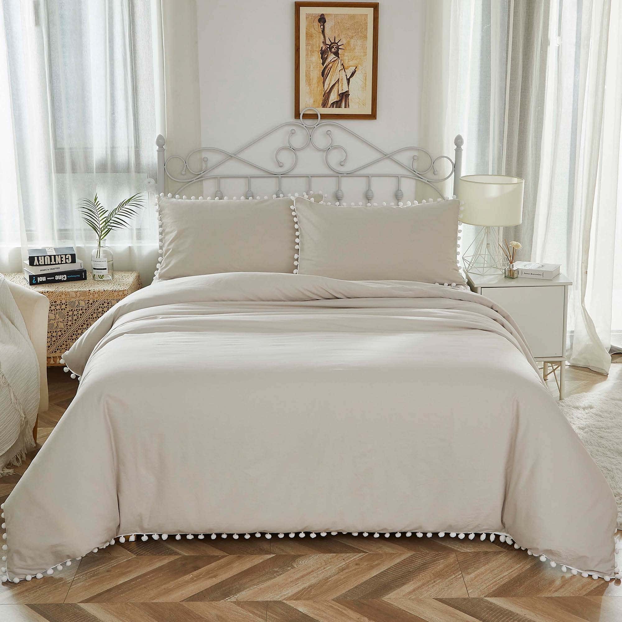 Set de Funda nórdica con Pompones 3 Piezas Beige Gris, 100%