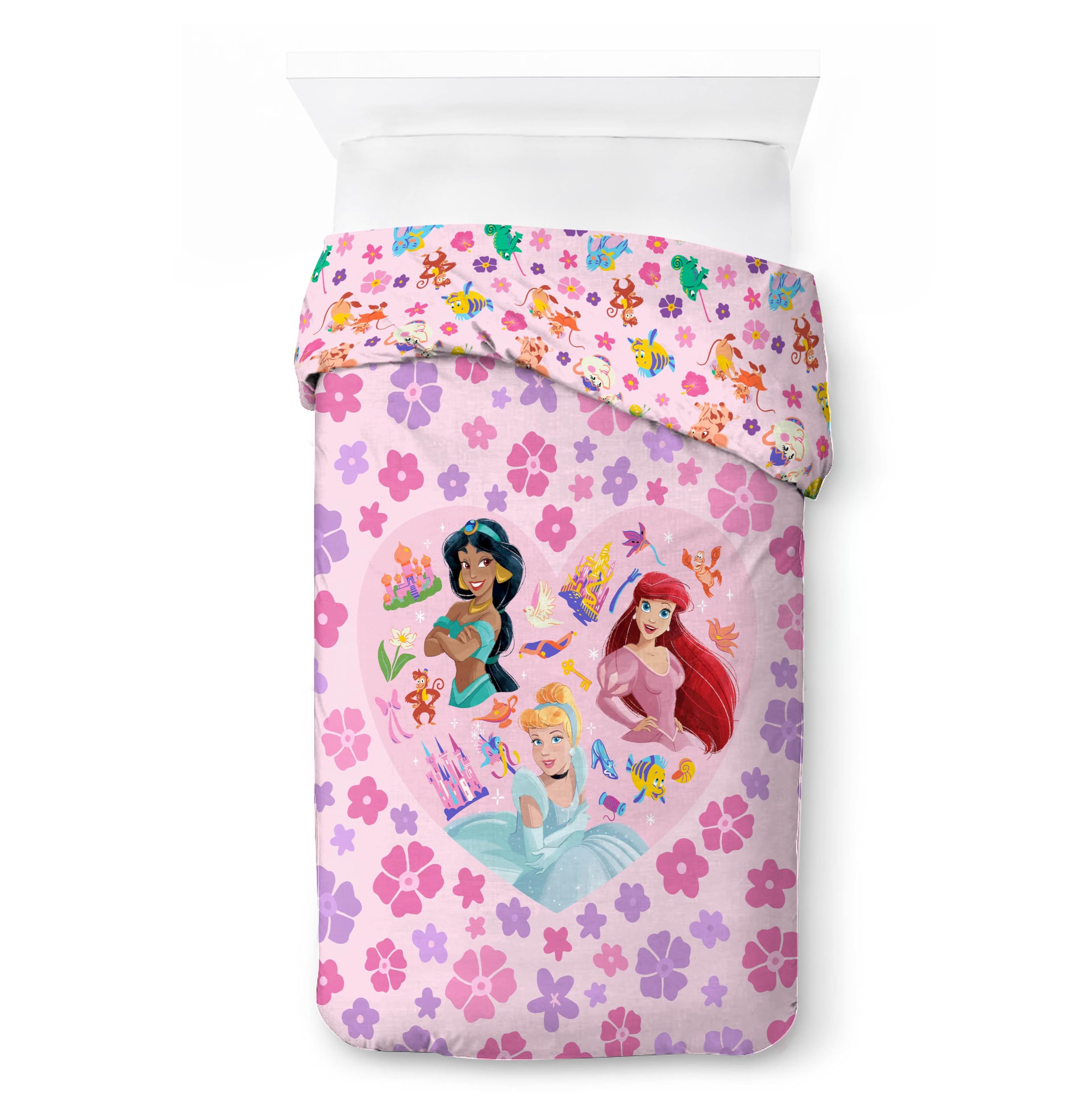 Transforma el dormitorio de tu hijo con nuestro set de funda nórdica de Disney Princesas de 2 piezas para cama individual, que incluye una funda nórdica y dos fundas de almohada a juego. Perfecto para añadir comodidad, estilo y personalidad a cualquier habitación infantil, este set le da vida a la hora de dormir con su diseño reversible y su toque lúdico. Fabricado con poliéster microfibra cepillado premium al 100%, la funda nórdica y las fundas de almohada son increíblemente suaves, duraderas y transpirables para un sueño reparador. La funda de edredón incluye un cierre de botones para un uso fácil y un ajuste seguro, mientras que el diseño reversible te permite cambiar el aspecto de la cama de tu hijo siempre que lo deseen. El set viene completo con una funda nórdica individual (64″ x 86″) y una funda de almohada a juego (20″ x 26″), facilitando la creación de un espacio de descanso coordinado y acogedor. Ideal tanto para niños como niñas, este set de funda nórdica es perfecto para uso diario, pijamadas o como un regalo considerado para cumpleaños y fiestas. Los vibrantes diseños con Moana, Cenicienta, Ariel, Rapunzel, Tiana, Bella y Jasmín añaden un toque de diversión a la decoración de cualquier dormitorio infantil, ayudando a estimular la imaginación y hacer que su habitación se sienta extra especial. Los padres amarán la conveniencia de este set de funda nórdica lavable a máquina, asegurando un cuidado fácil y colores de larga duración que permanecen geniales lavado tras lavado. Dale a la habitació. de tu hijo una actualización fresca con este divertido, versátil y elegante set de funda nórdica de Disney la manera perfecta de crear un ambiente de descanso cómodo y acogedor que les encantará!