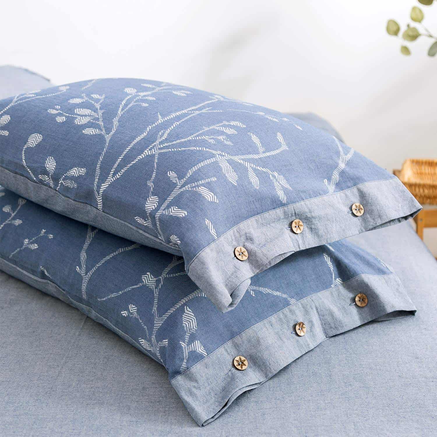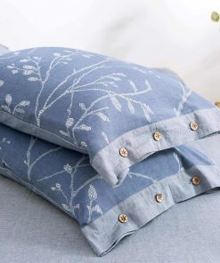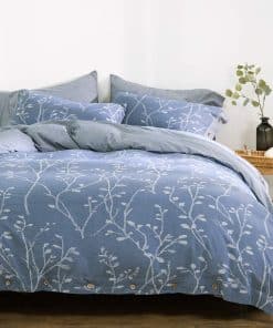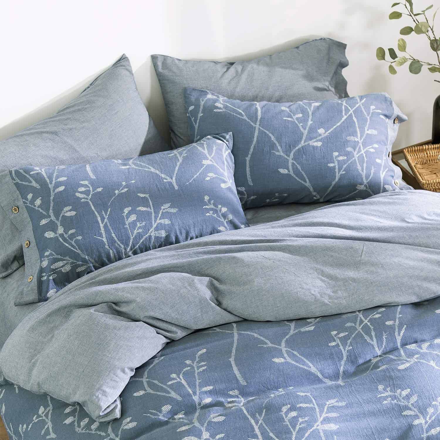 1. El tejido está tejido a partir de hilo de algodón lavado. El hilo de algodón lavado es el material crudo manipulado por un proceso especial, es más suave y más cómodo que otros materiales. 2. ¡Patrón impreso No! El patrón de las ramas en la funda nórdica no está impreso, sino que es jacquard. El patrón se ha formado en el proceso del tejido de la tela. Todavía podemos diseñar un hermoso patrón sin tintes, por lo que esta funda nórdica no olerá extraño. Es un producto de lujo y alta calidad. 3. Tamaño Completo/Reina: 1 Pieza de Funda nórdica 90×90 pulgadas y 2 Piezas de Fundas de almohada 20×26 pulgadas. 4. Funda nórdica con lazos en las cuatro esquinas para sostener el edredón y cierre de botones. La funda de almohada adopta un diseño de costado y cierre de botones. 5. Lavar a máquina en agua fría. Secar a baja velocidad. No usar lejía. No lavar en seco.