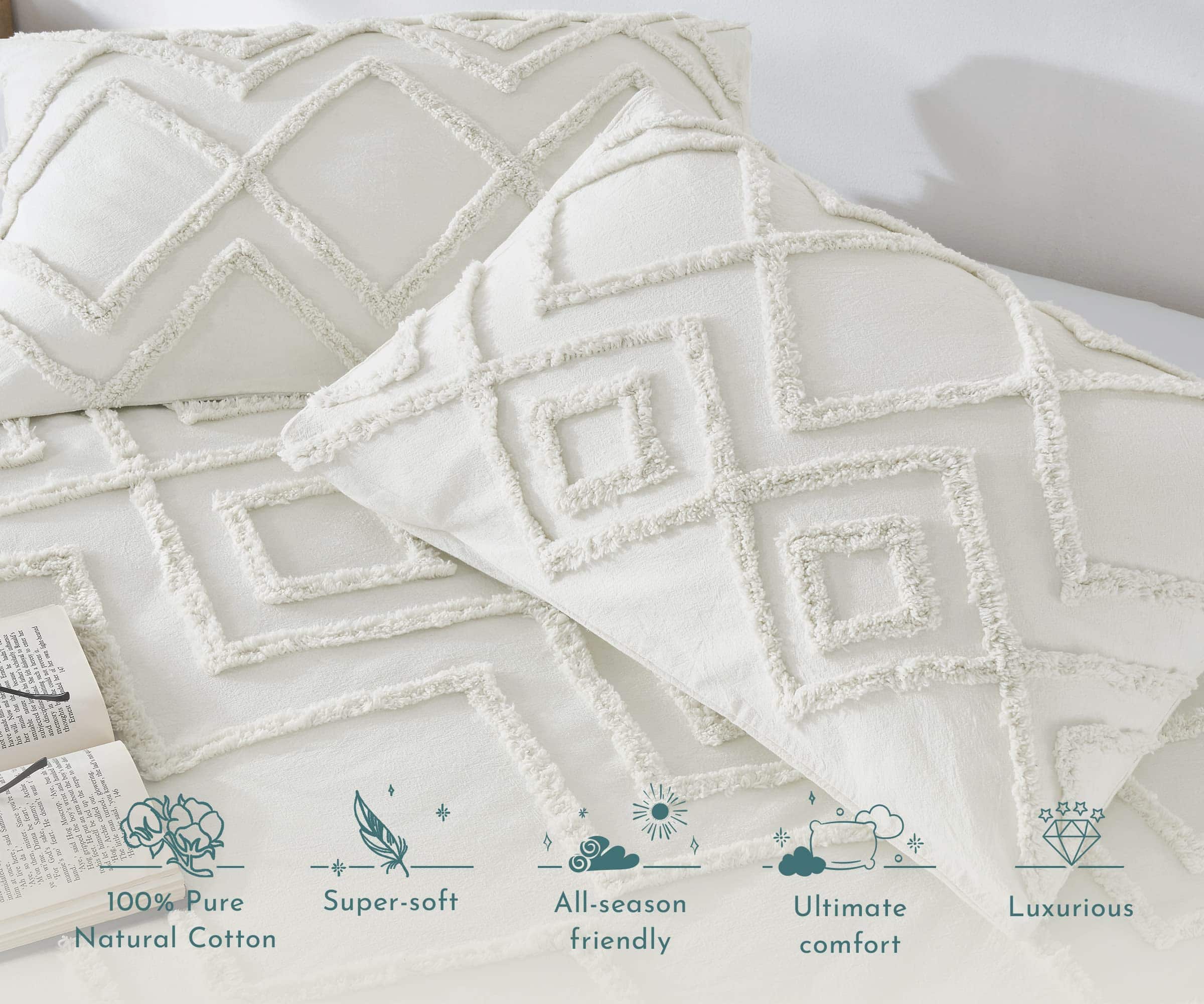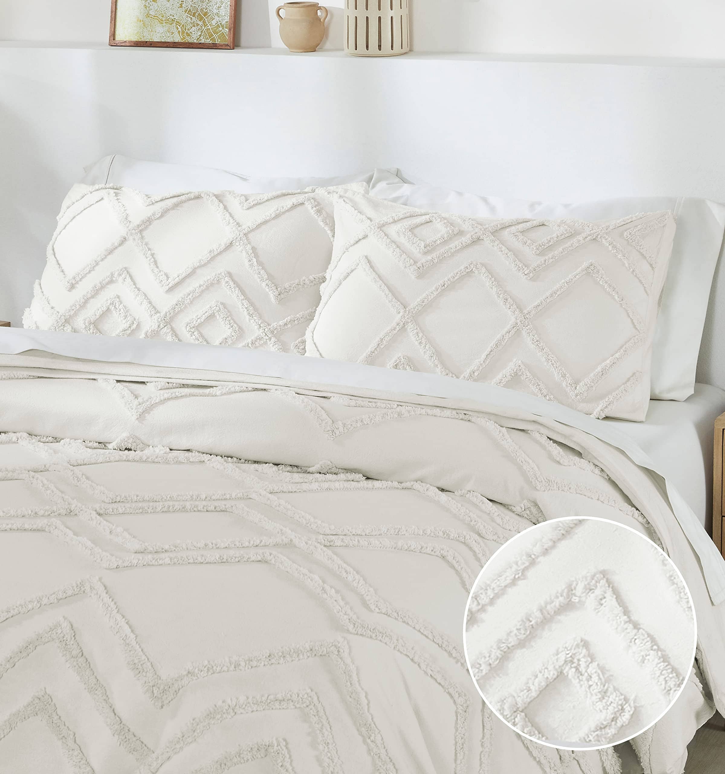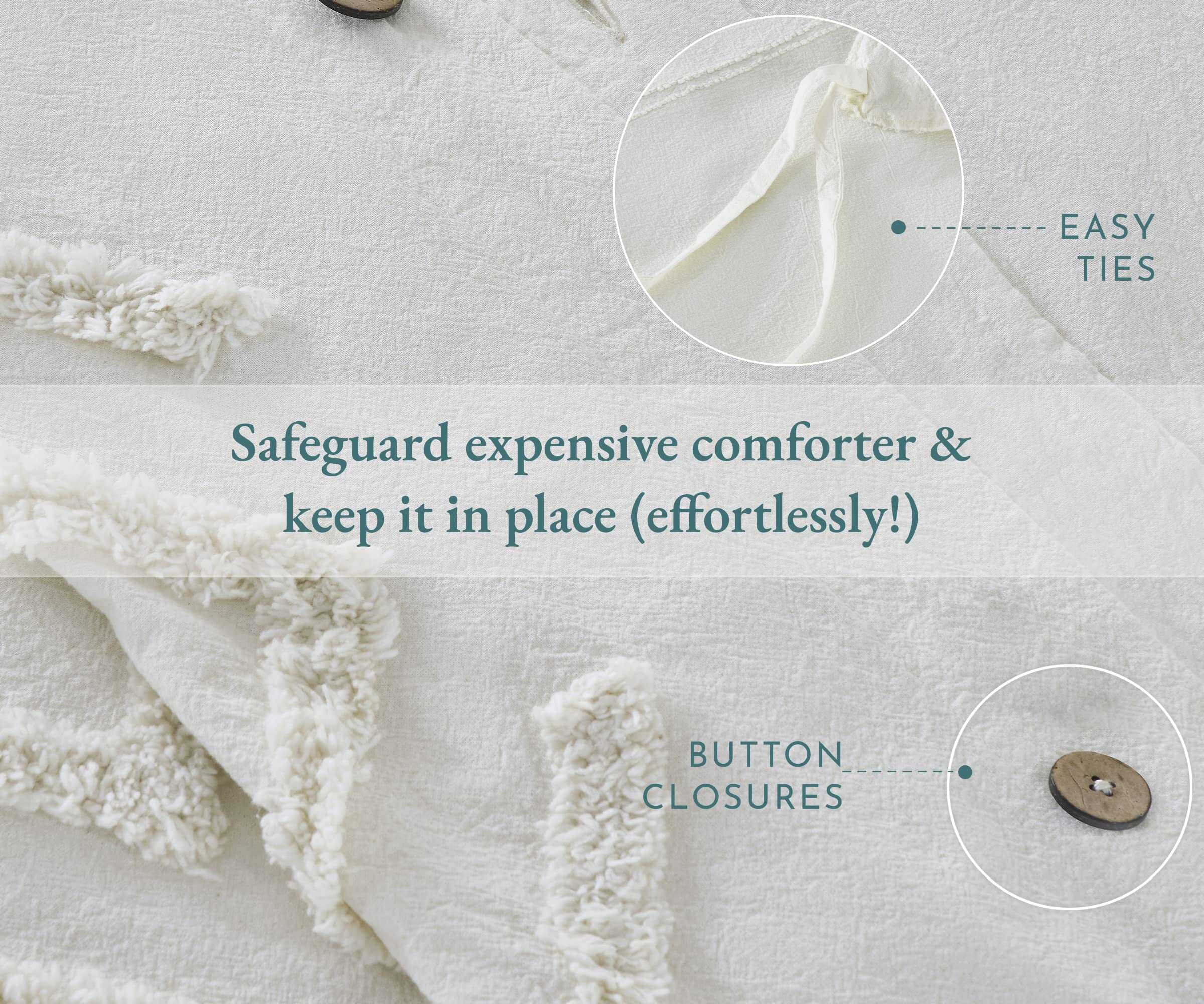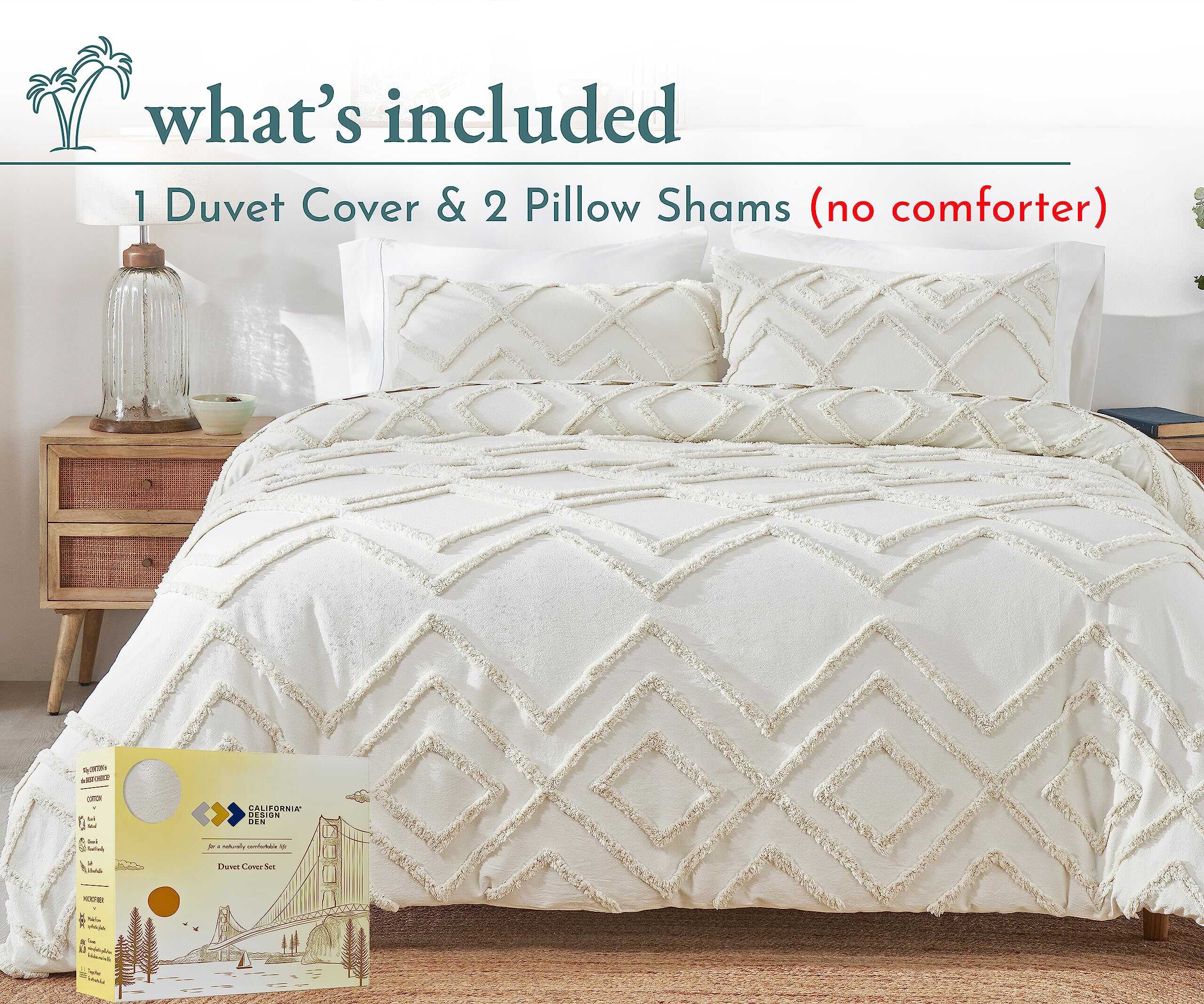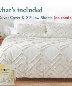 1. EL BOHO TUFTED ELEGANTEMENTE RÚSTICO: Nuestro juego de 3 piezas de funda nórdica y funda de almohada Boho Tufted con textura de algodón 100% es una amalgama perfecta del espíritu bohemio artístico pero estético para animar la decoración de tu dormitorio con un aspecto lujosamente rústico. El algodón natural puro brinda comodidad y la relajación perfecta que necesitas para comenzar el día de la mejor manera. Despierta renovado como nunca antes con esta funda de duvet elegantemente diseñada y con textura suave. 2. PROTEGE TU COSTOSO EDREDÓN Y MANTENLO EN SU LUGAR (¡sin esfuerzo!): Gracias a nuestra duradera funda de edredón queen con lazos fáciles y cierres de botón, nunca más tendrás que preocuparte por manchas y rasgaduras que arruinen tu costoso edredón. O, que tu edredón se amontone. 3. GENIAL PARA TU PIEL: Libre de sustancias dañinas, la funda de duvet boho queen es una alternativa extremadamente saludable para una vida sostenible. 4. FÁCIL CUIDADO, TRANSPIRABLE Y REFRESCANTE: Lavables a máquina, estas suaves fundas de duvet, diseñadas para durar mucho tiempo, ofrecen un efecto refrescante durante el verano y el calor necesario durante el invierno. 5. NUESTRO COMPROMISO: Este juego de funda de duvet texturizado de 3 piezas incluye 1 Funda de Duvet de Algodón (92 «de ancho x 90» de largo) y 2 Fundas de Almohada a Juego (21 «de ancho x 27» de largo). Puedes probar las fundas de duvet y, si no te gustan por cualquier motivo, puedes devolver el producto dentro de 30 días según las políticas de MercadoLibre.