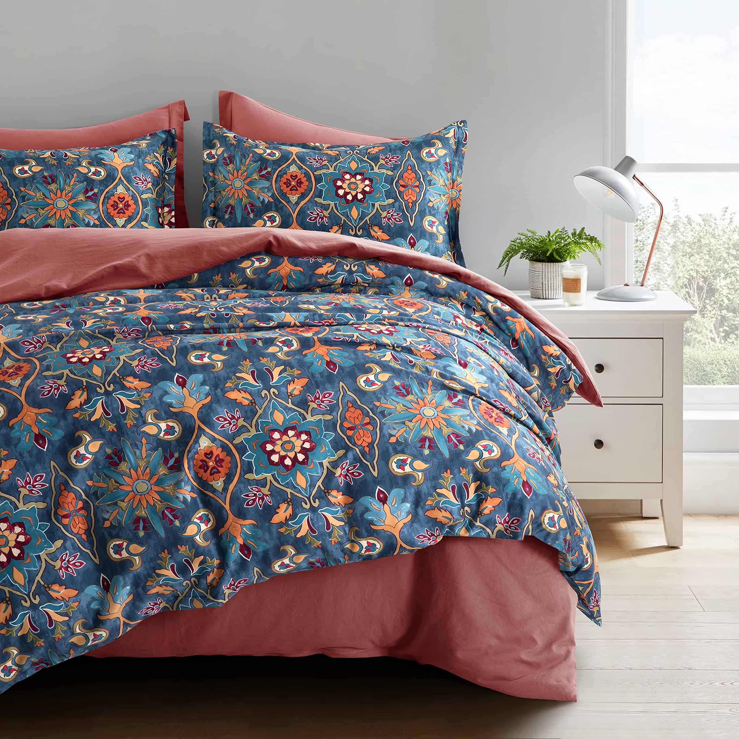 Protege tu inserto de la funda nórdica mientras te mantienes cómodo y seguro. Los medallones de damasco de alfarería tradicional reciben un aspecto contemporáneo en esta funda nórdica en una paleta de tonos tierra como beige, azul, cobre y óxido. Tejida de algodón satén de 400 hilos sin arrugas, tu funda nórdica se verá suave y recién planchada, directamente de la secadora.