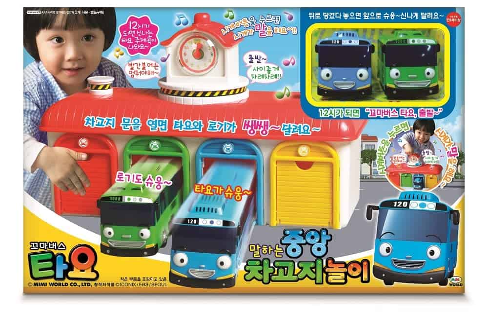 2. Reloj parlante con 10 frases, tema de Tayo y 2 efectos de sonido: Cada vez que son las 12 en punto, la frase «¡El pequeño autobús Tayo se va!» y el tema de Tayo aparecen. Y, hay diversas frases en coreano, como «El mini coche empieza a ir uno por uno.»,» Tengo miedo.», «¡Animémonos para hoy!», «¡Ve y disfruta a tope! rum rum», «Al camino seguro con cuidado.», «Ve con la luz verde», «Detente en la luz roja.» y «Beep, beep.».