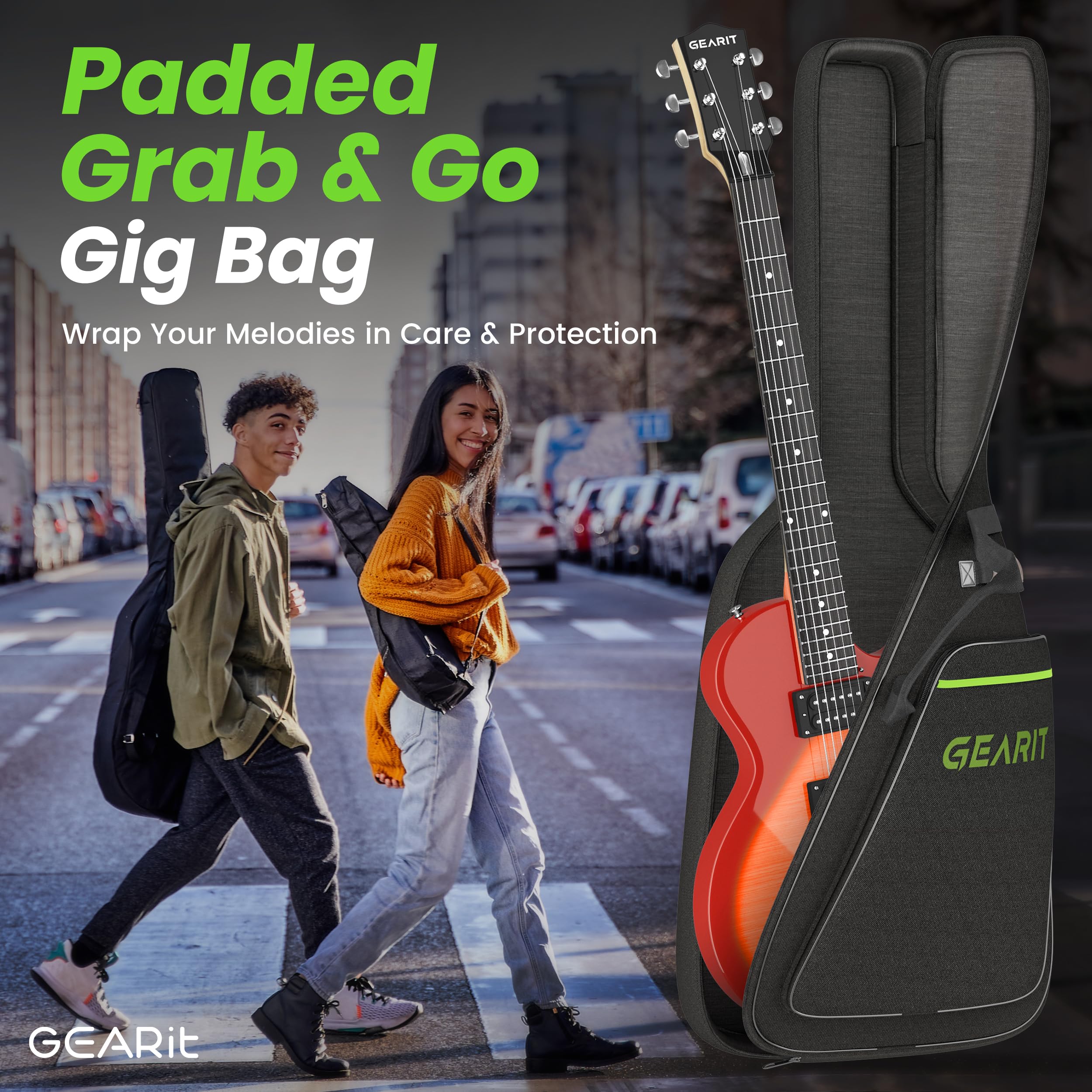 5. Kit de Inicio Incluye: La Guitarra Eléctrica GI-155 Valley Series de 39″ Single Cut con pastilla Humbucker de bobina dividida, un amplificador recargable de 10W con funcionalidad Bluetooth para conectar tu teléfono/tableta y tocar, una funda acolchada de 5mm, 6 puas de guitarra, una correa de guitarra, un cable de instrumento, un afinador electrónico, cuerdas extra, un paño suave y un ajustador de varillas.