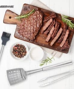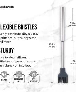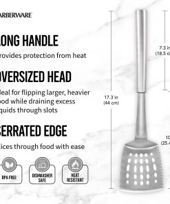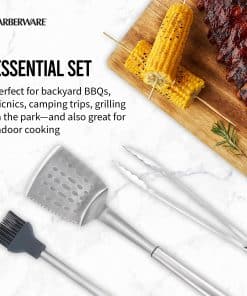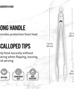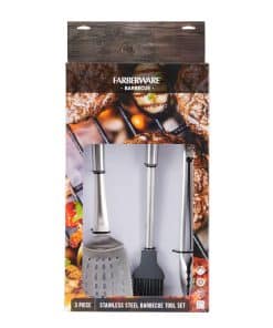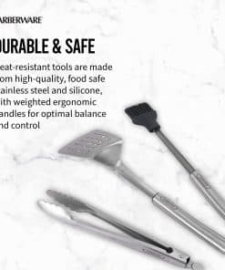 Este Set de herramientas de acero inoxidable para BBQ de Farberware incluye todas las herramientas esenciales que necesitas para voltear, girar, untar y transportar alimentos en la parrilla. El turner cuenta con una cabeza grande para manejar incluso trozos de carne más grandes, un borde dentado para cortar fácilmente sobre la marcha y ranuras que ayudan a drenar los líquidos en exceso. Las cerdas de silicona grandes del pincel para untar se deslizan suavemente sobre los alimentos para obtener resultados óptimos, y la cabeza es resistente al calor hasta 500 F/260 C y seguro para uso en todos los utensilios de cocina, incluidos los antiadherentes. Las pinzas están diseñadas con dientes de acero inoxidable para sujetar firmemente los alimentos y evitar que se caigan, además de un mecanismo de bloqueo fácil que permite un almacenamiento conveniente. Cada herramienta tiene un mango largo de acero inoxidable para mantener las manos alejadas del calor. El set de 3 piezas incluye turner ranurado, pincel para untar y pinzas. Apto para lavavajillas.