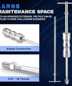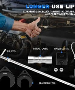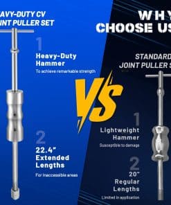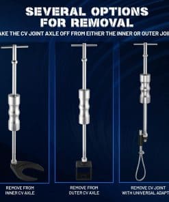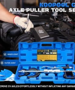 Set de Herramientas de Extracción de Ejes CV de 10 Piezas KOOPOOL: Martillo Deslizante, Horquillas de 2″ y 2.5″ para la Remoción Sin Esfuerzo de Juntas CV es su solución todo en uno para la remoción de ejes CV. El kit incluye un martillo deslizante resistente, horquillas de 2″ y 2.5″ para juntas CV, un adaptador de cable de acero y un adaptador de junta CV externa. Con este set, podrá quitar ejes CV o semiejes de manera eficiente y segura, evitando daños a los componentes de su vehículo. El martillo deslizante potente y fácil de usar hace que la operación sea rápida y sin complicaciones. Fabricado con acero 1045 tratado térmicamente, este set de herramientas de extracción de ejes CV garantiza durabilidad y rendimiento a largo plazo. Ya sea que sea un mecánico profesional o un entusiasta del bricolaje, este set de herramientas es imprescindible para cualquier trabajo de remoción de ejes CV.