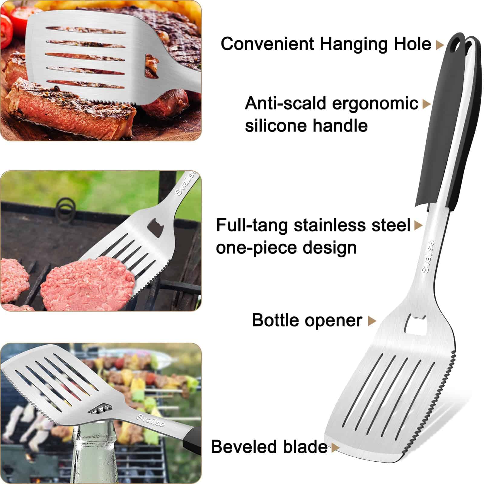 5. Juego de Herramientas para Asar Multifuncional: La espátula para asar tiene las funciones de cortar, voltear y abridor de botellas en una sola herramienta; el tenedor para asar es perfecto para perforar y levantar alimentos; las pinzas para alimentos tienen mangos lo suficientemente largos y pueden ajustar el tamaño de la abertura y bloquear