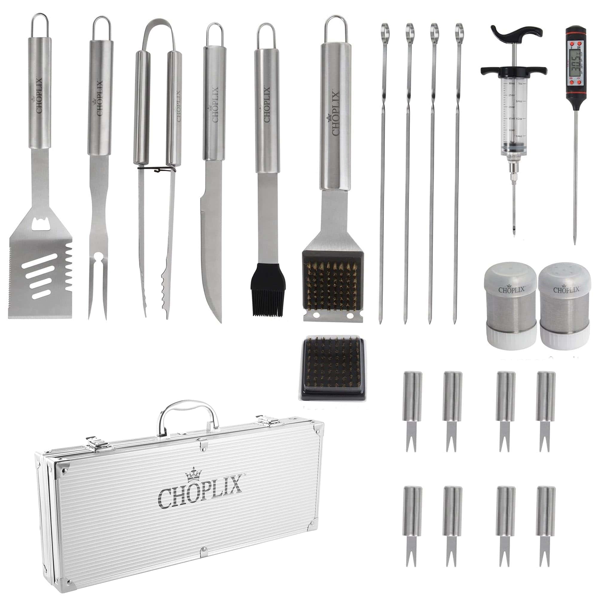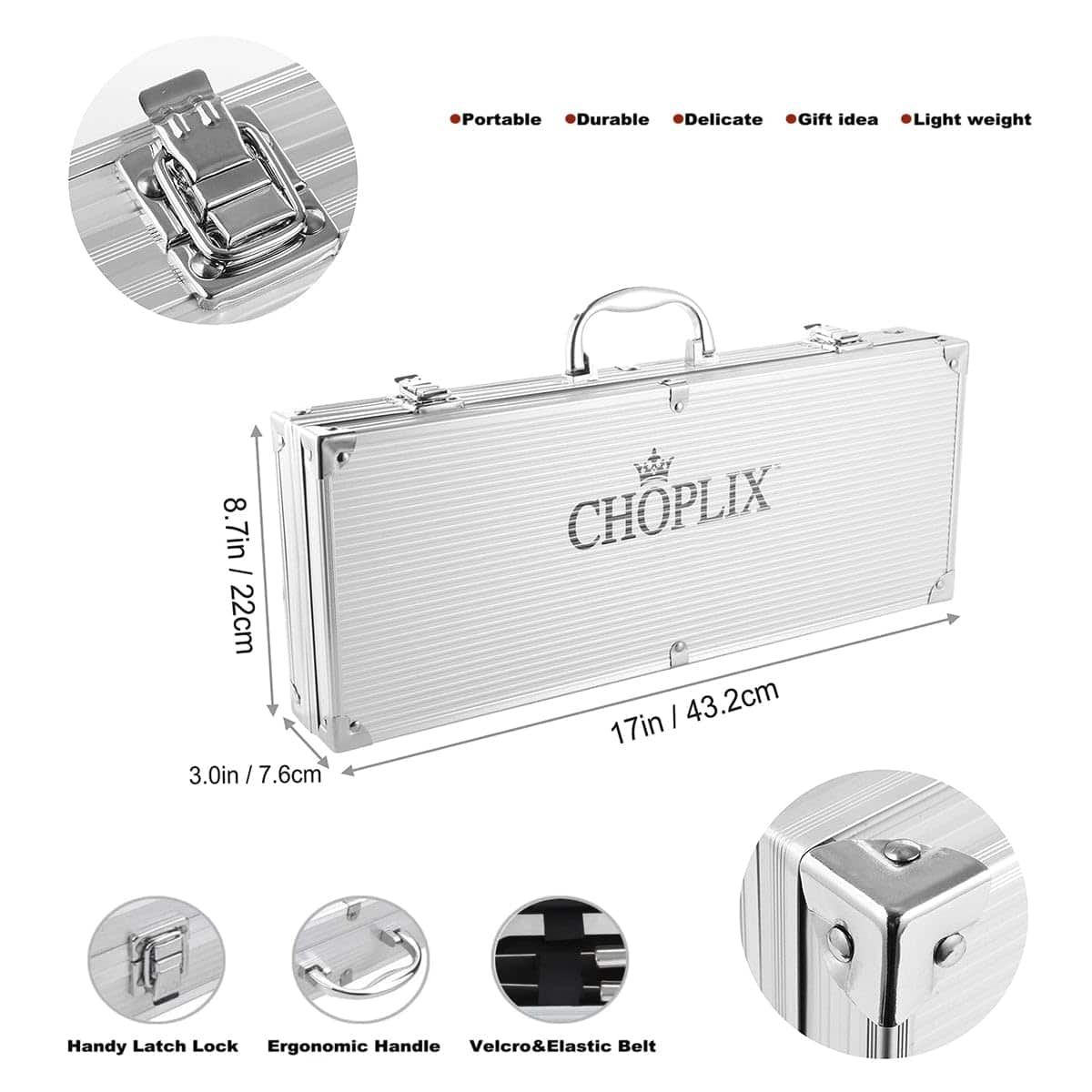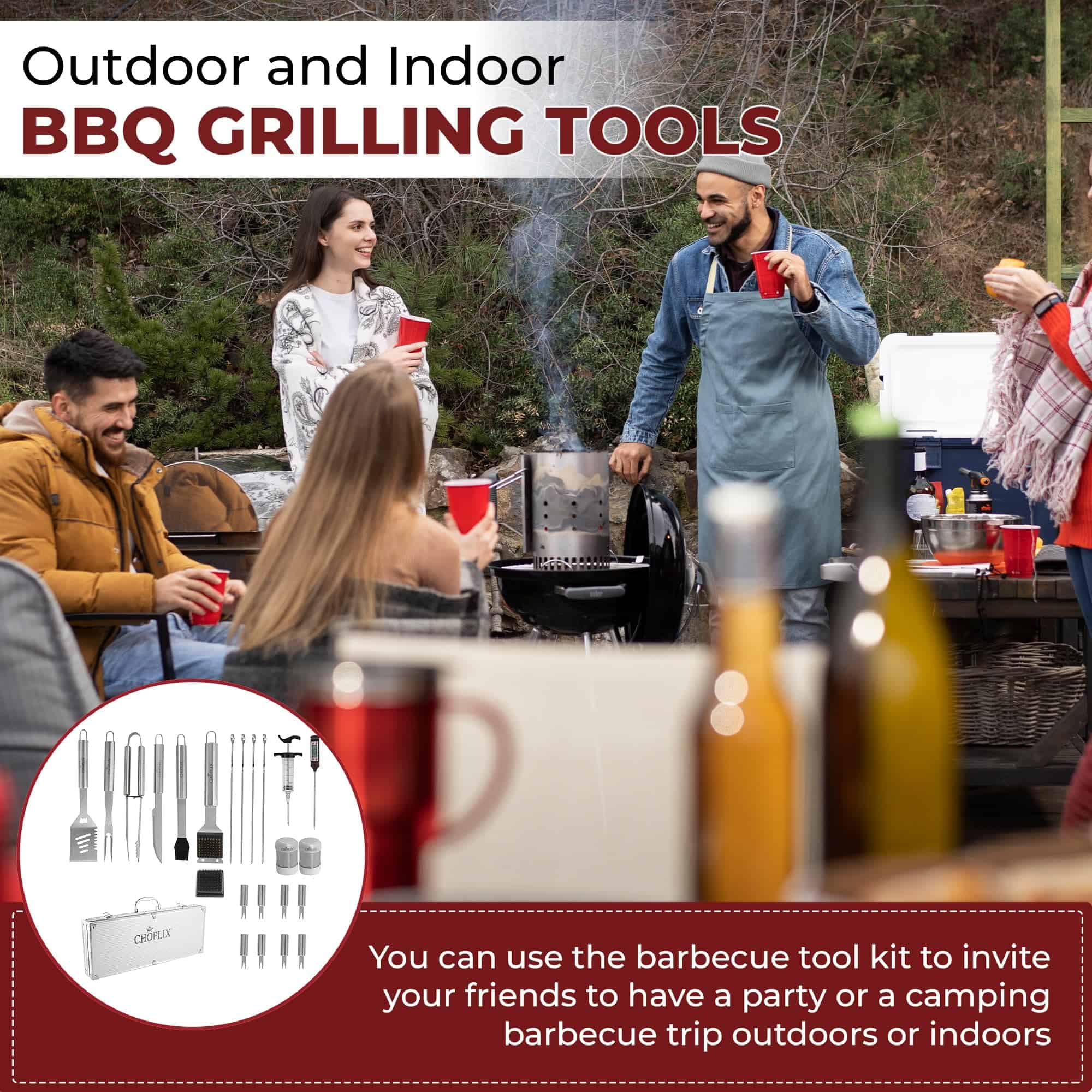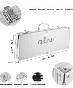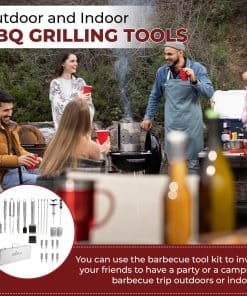 Este accesorio para parrilla incluye herramientas esenciales para la barbacoa, como una espátula 4 en 1, tenedor para carne, pinzas, inyector de carne, termómetro, cepillo de limpieza, porta elotes, saleros y pimenteros, cuchillo, pincel de adobo y brochetas para barbacoa. El estuche de aluminio elegante y duradero mantiene todas tus herramientas organizadas y protegidas. Ya sea que estés asando en tu patio trasero, yendo de campamento o asistiendo a una reunión al aire libre, los accesorios para la parrilla hacen que sea fácil transportar todo tu set. Cada herramienta de parrilla está pensada para tener mangos ergonómicos que proporcionan un agarre cómodo y seguro. Estos mangos reducen la tensión durante sesiones de parrilla prolongadas y ofrecen un manejo sencillo, asegurando precisión y control al voltear y cortar. Limpiar después de la parrilla nunca ha sido tan fácil. Todos los utensilios para acampar en este set son aptos para lavavajillas, ahorrándote tiempo y esfuerzo. Su diseño fácil de mantener asegura que puedas disfrutar de tu barbacoa sin preocuparte por la molestia de fregar.