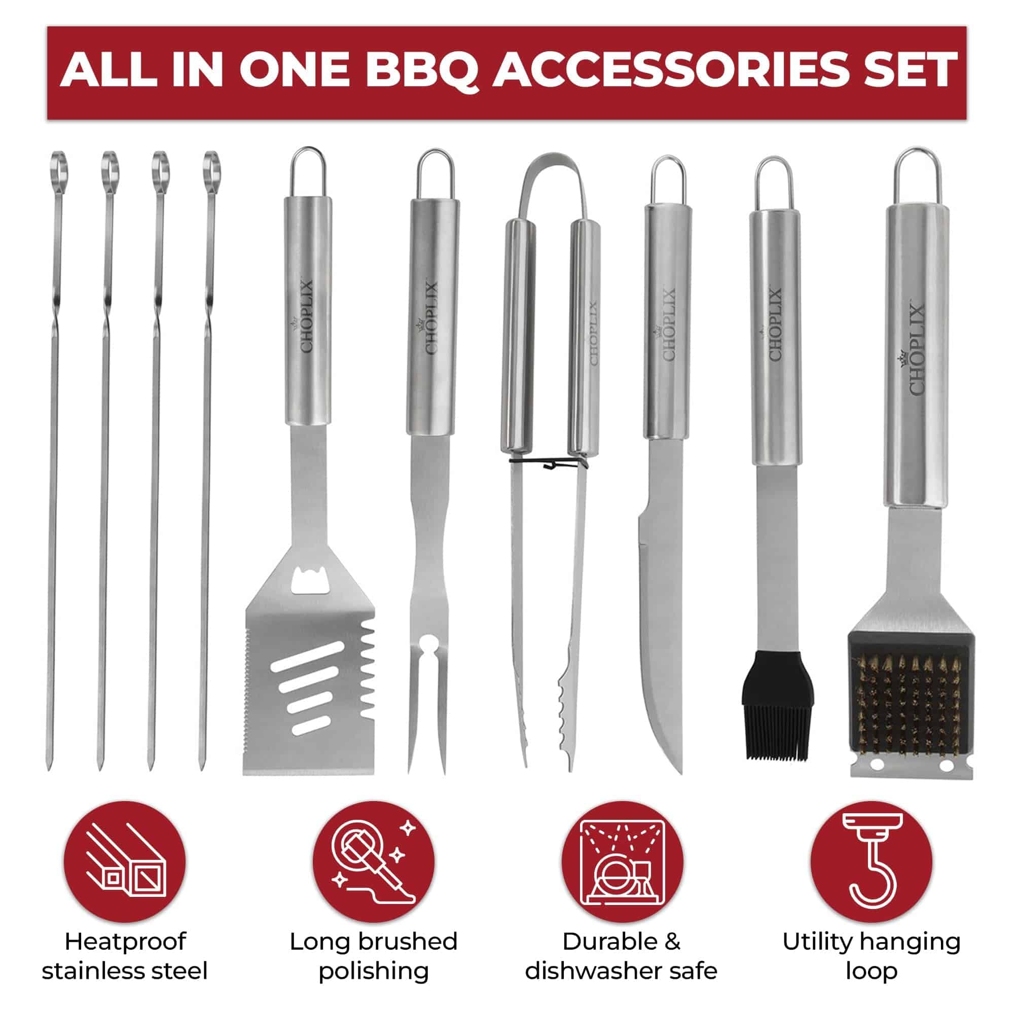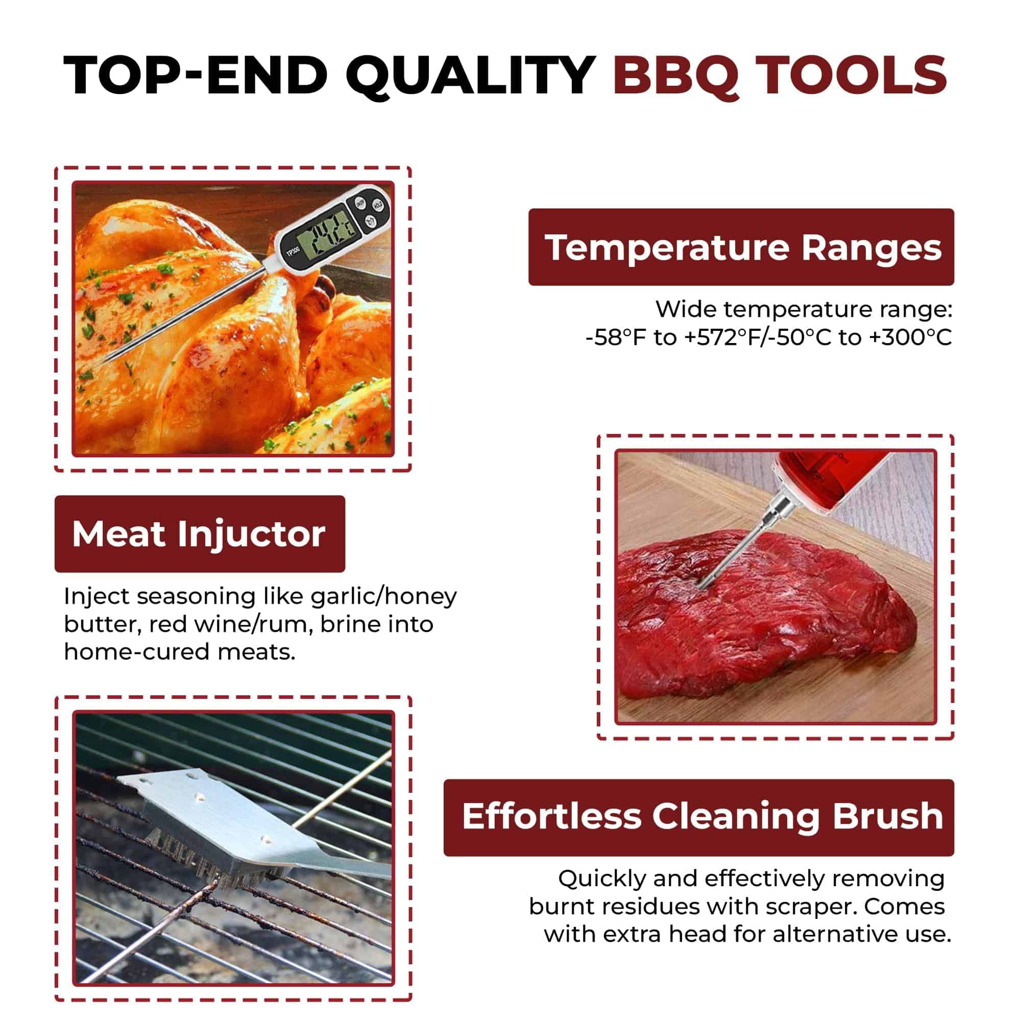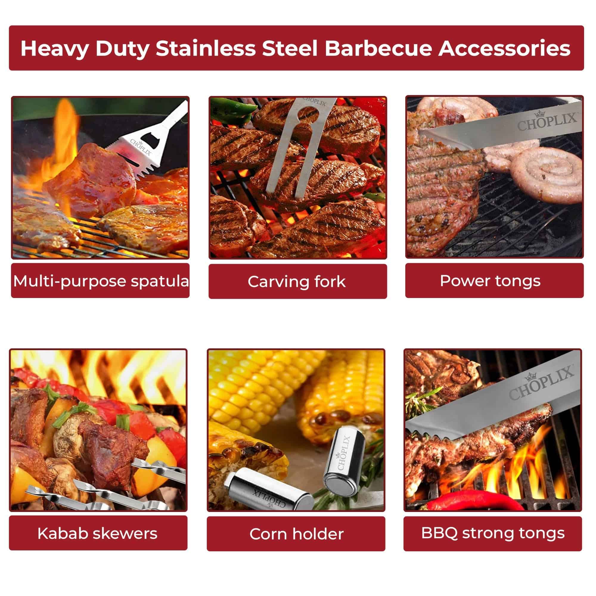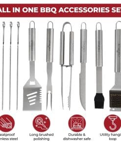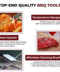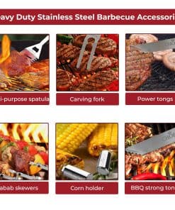 Cada herramienta en el set está meticulosamente elaborada con acero inoxidable de alta calidad, garantizando una durabilidad superior y resistencia al óxido. Estas herramientas resistentes están diseñadas para perdurar y proporcionar un rendimiento confiable en todas tus aventuras de parrilla.