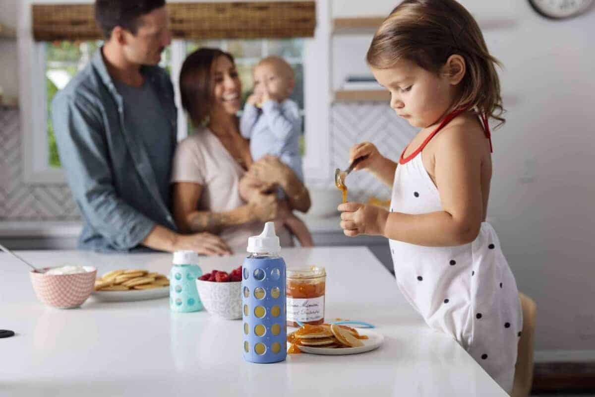Set de Inicio de 6 Botellas Lifefactory, (4) botellas de 4 onzas para bebé en Menta/Lavanda, (2) botellas de 9 onzas para bebé en Col rizada/Uva, (2) Tapas Planas, (2) Tapas Antiderrame, (2) Picos de Etapa 3
