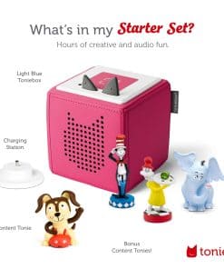 5. El paquete incluye una Toniebox rosa, estación de carga, Sam el Bombero, Horton Escucha a Quién, Gatito en el Sombrero y Cachorro de Tiempo de Juego Tonies. Tonies adicionales se pueden comprar por separado.