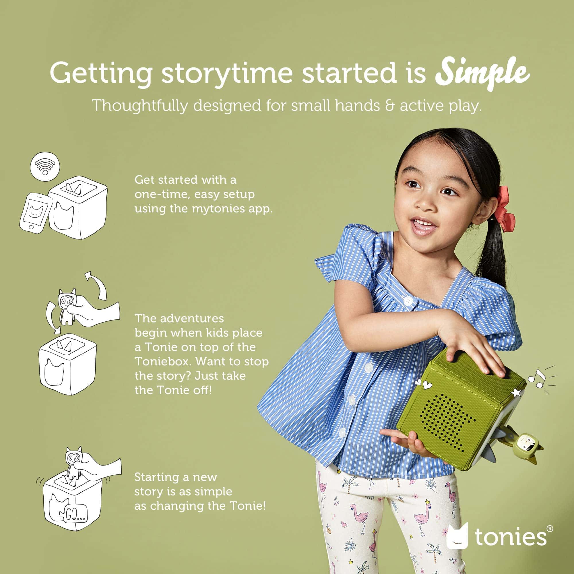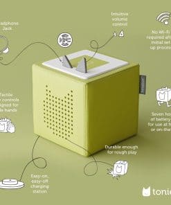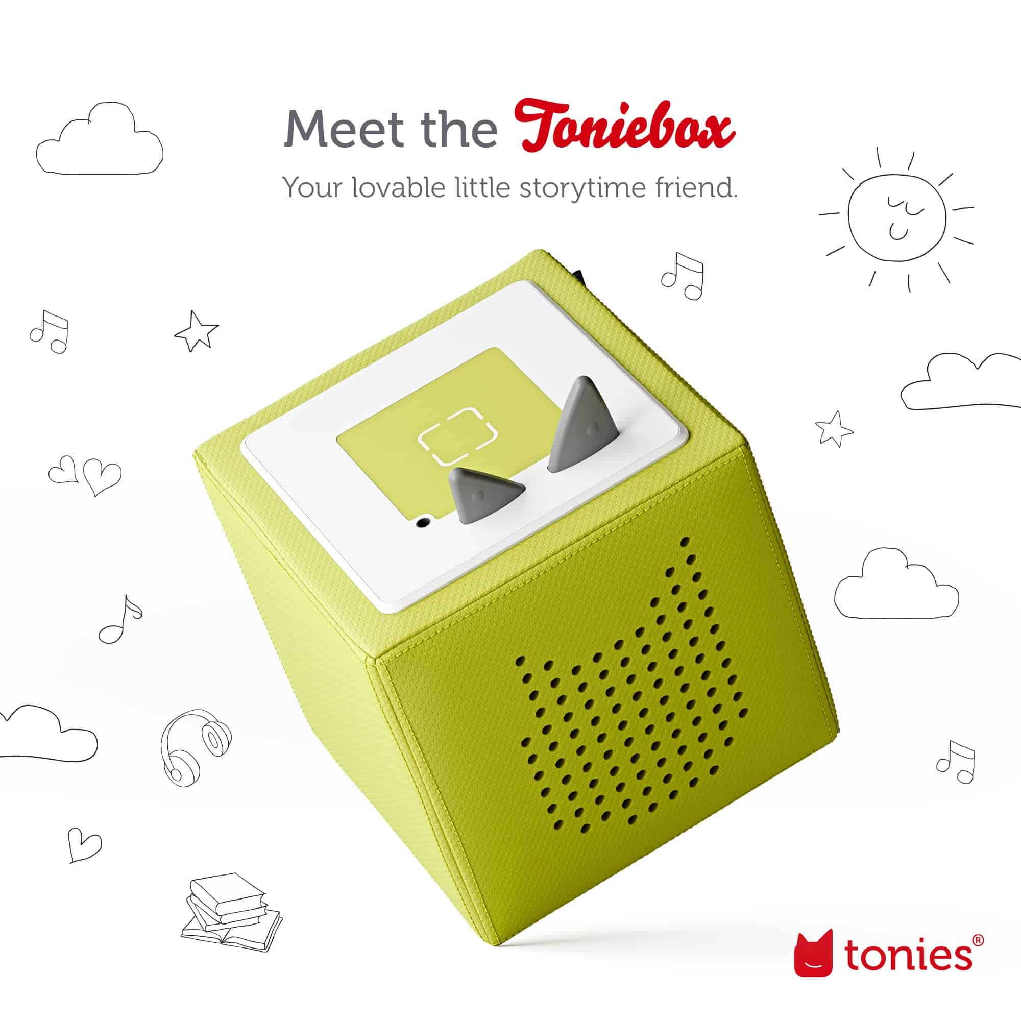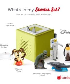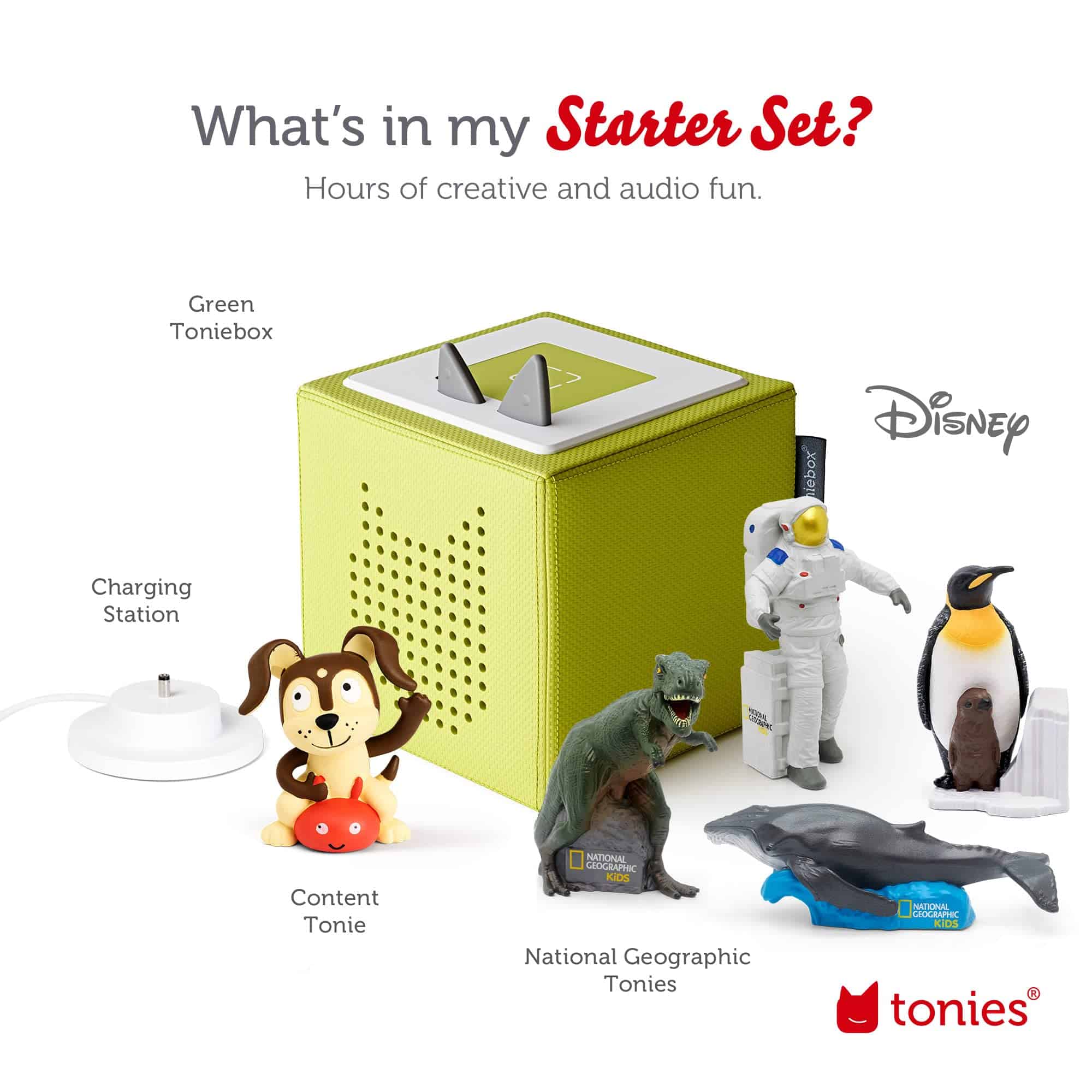 5. El paquete incluye una Toniebox verde, estación de carga, Cachorro de Juego y Tonies de Astronauta de National Geographic, Ballena, Dinosaurio y Pingüino. Tonies adicionales se pueden comprar por separado.