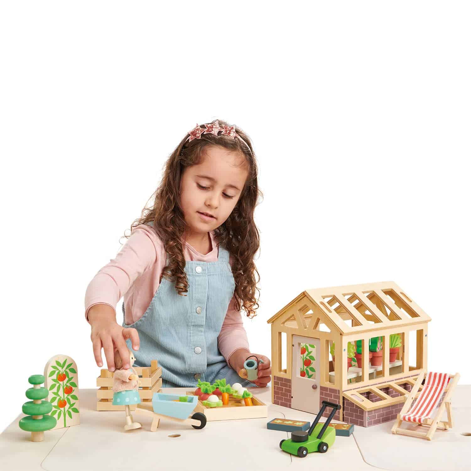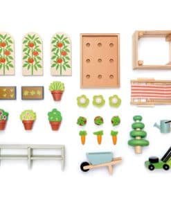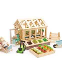 En el corazón del set se encuentra un invernadero de contrachapado tradicional, completo con una base, una puerta abatible y dos paneles de techo extraíbles. En su interior, los jóvenes jardineros encontrarán todo lo que necesitan para cuidar sus plantaciones, incluidas dos bandejas de semillas, un práctico banco de plantación, cuatro plantas en maceta y tres arbustos de tomate prósperos.