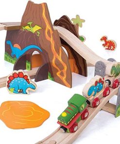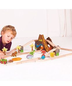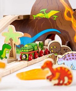 Ganador del Premio Platinum Seal de Oppenheim para 2015 – este conjunto de ferrocarril de la línea de fantasía Dino Range reúne ferrocarriles y dinosaurios en un colorido paisaje prehistórico. Este set de juego de 49 piezas incluye pistas de madera de alta calidad, una locomotora de ferrocarril de dinosaurio y dos vagones, túneles de volcán, un grupo de dinosaurios de madera y árboles. Jugar con trenes es una excelente manera de fomentar el pensamiento creativo y narrativo, la imaginación y la coordinación, desarrolla habilidades motoras gruesas y finas, y la coordinación mano-ojo, y fomenta la resolución de problemas. Los acoplamientos magnéticos en el tren aseguran la compatibilidad con todas las demás locomotoras y vagones de la gama Bigjigs Rail. Accesorios adicionales están disponibles para expandir este set. La mayoría de las otras marcas principales de ferrocarriles de madera son compatibles con Bigjigs Rail. Hecho de materiales de alta calidad obtenidos de forma responsable. Conforma a las normas de seguridad actuales ASTM y CPSIA. Edad 3+ años. Consta de 49 piezas de juego. Ancho: 37.4″, Profundidad: 24.02″ (ensamblado).