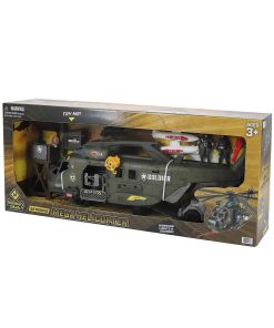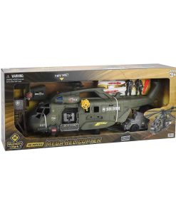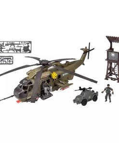 El set de Mega Helicóptero incluye un Mega Helicóptero Militar, un Vehículo de Combate, dos figuras de acción, una Torre de Observación, Misiles y muchos accesorios. Los niños pueden llevar este helicóptero con un asa para jugar en interiores y exteriores. El piloto cabe en la cabina para llevar a cabo una misión secreta. Utiliza el lanzador de proyectiles debajo del helicóptero para disparar contra los invasores con la torreta de armas deslizante. La grúa funcional puede cargar figuras arriba y abajo. Este helicóptero también tiene suficiente espacio para guardar el vehículo de combate y aterrizarlo en el suelo desde la rampa trasera. Aun más divertido, este mega helicóptero está equipado con luces y sonidos realistas, una hélice giratoria libre, un set de armas, para hacer este set de juego aún más divertido. Además, anima a los padres a armar esas piezas junto con su hijo para construir el set completo.
