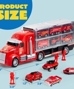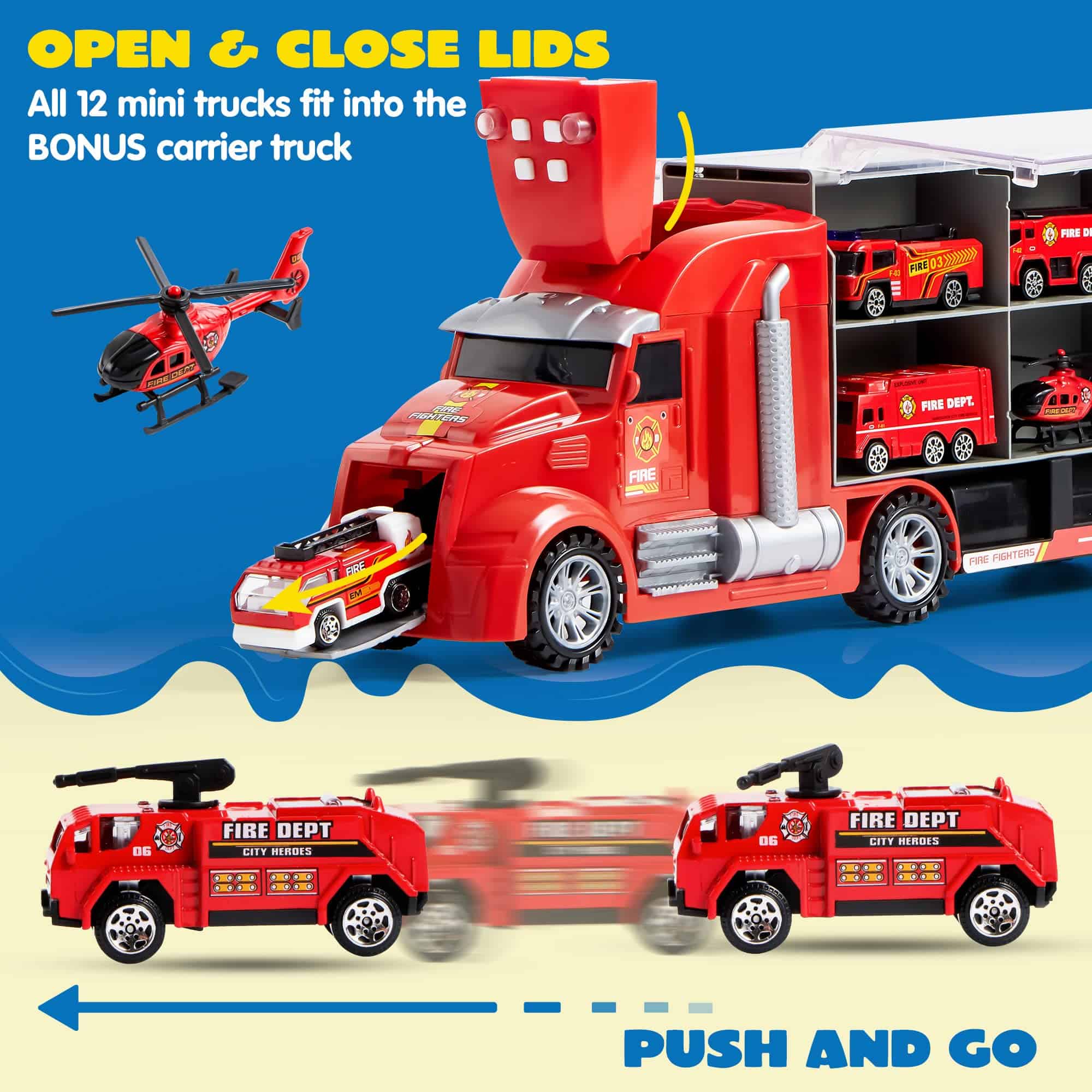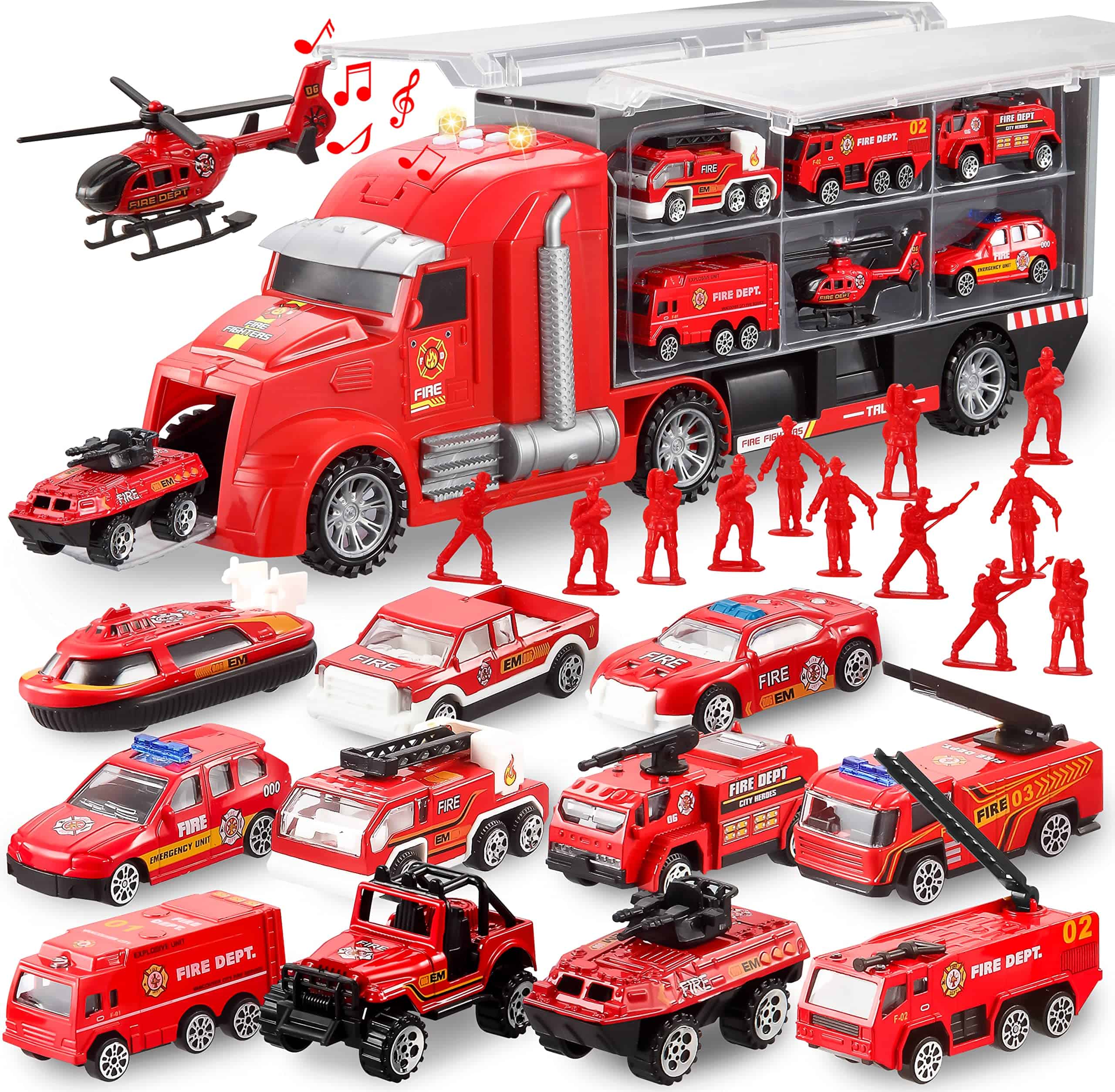 Camión portador de rescate de incendios de 25 piezas con 12 vehículos de fundición a presión y 12 figuras