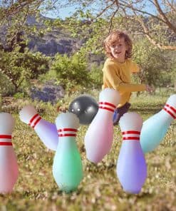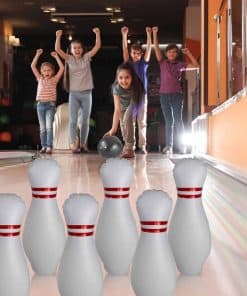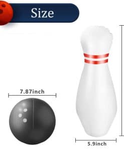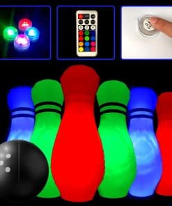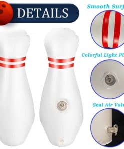 Juego de bolos inflable grande con luces. El conjunto incluye 6 Pines Blancos Luminosos y una Pelota. Suficientes bolas de bolos para experimentar el juego completo y compartir un buen rato. Ilumínelos con control remoto. Nuestro paquete incluye 6 Luces con control remoto fácil de instalar y controlar. Las luces tienen 13 colores y 3 modos intermitentes. Puedes ajustar diferentes colores y modos según la ocasión y tus preferencias. Juguetes perfectos para todos. Después de inflarlo, podrás jugar con él. La pelota es ideal para los niños o para fomentar el interés de los niños en el deporte. Para adultos, puede usarse como un proyecto de entretenimiento en compañía o para brillar en la fiesta y activar el ambiente festivo. Juega en interiores o exteriores. El juguete inflable de bolos es muy conveniente de transportar y no derrama. De día o de noche, podrás jugar con tu familia y amigos en interiores, llevarlo a la oficina como entretenimiento o jugar en el patio, parque o fiesta. Materiales seguros y duraderos. El juguete de bolos inflable está hecho de plástico duradero con suficiente grosor para evitar que se punza. Este es un conjunto de juguetes para cualquiera que le guste jugar a los bolos.