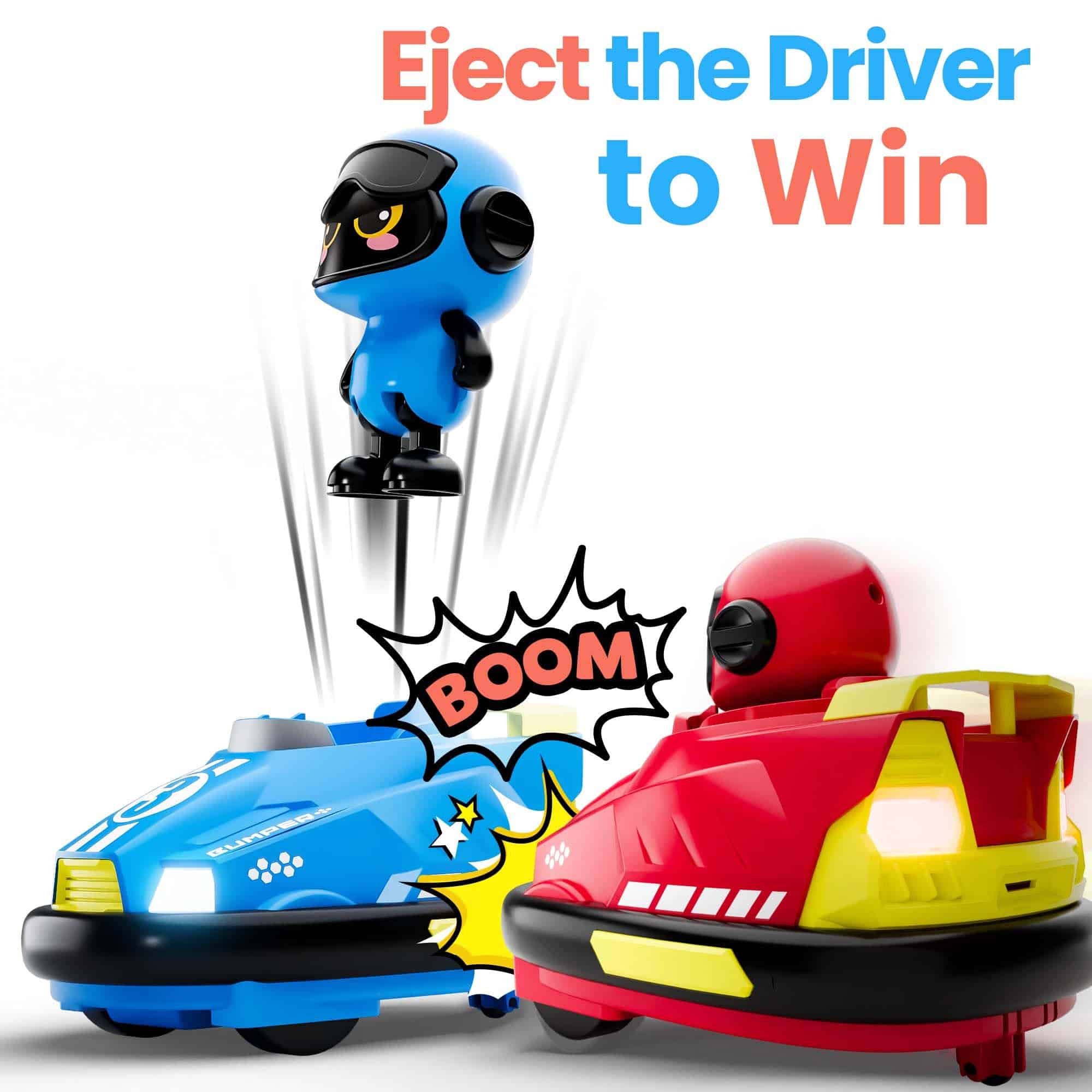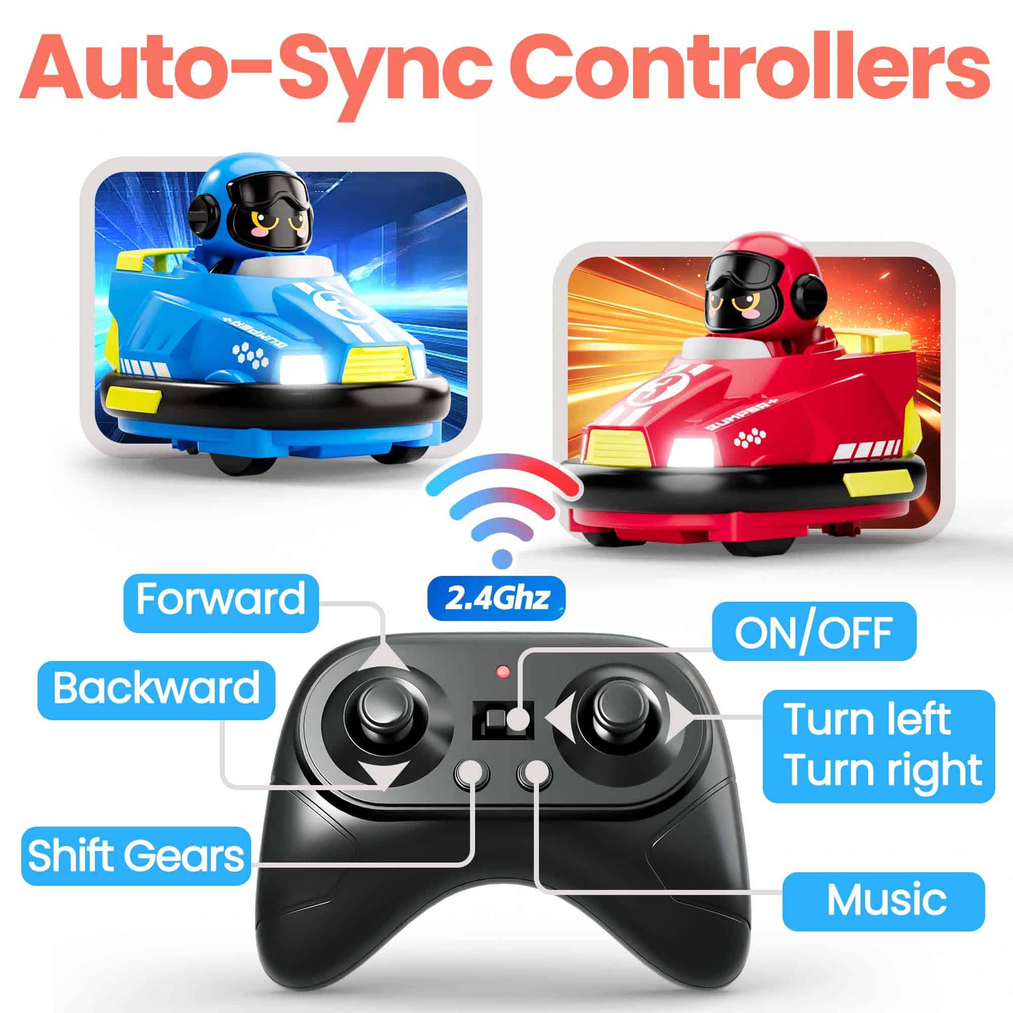 3. ¡Boom, Sorpresa! ¡Gana! El set de coches de carreras RC permite emocionantes competencias, donde chocar contra el costado de un coche activa una acción de sorpresa para el juguete de la figura, anunciando a la parte victoriosa.