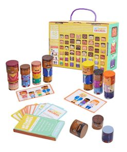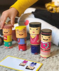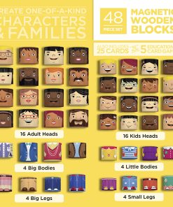 EL SET MyFamilybuilders INCLUYE 48 bloques de madera magnéticos hechos a mano que vienen en 12 tamaños: 16 cabezas de adultos, 16 cabezas de niños, 4 cuerpos grandes, 4 cuerpos pequeños, 4 piernas grandes, 4 piernas pequeñas; 3 bloques (cabeza, cuerpo y piernas) conforman un personaje. 25 tarjetas grandes para jugar a 5 divertidos juegos educativos en conjunto con los 48 bloques de madera únicos. Los 5 juegos fueron diseñados por un especialista en educación para diferentes etapas de edad (3+; 4+; 5+; 6+) para crear momentos de aprendizaje para que los padres ayuden a sus hijos a entender y aprender que las diferencias son algo para celebrar.