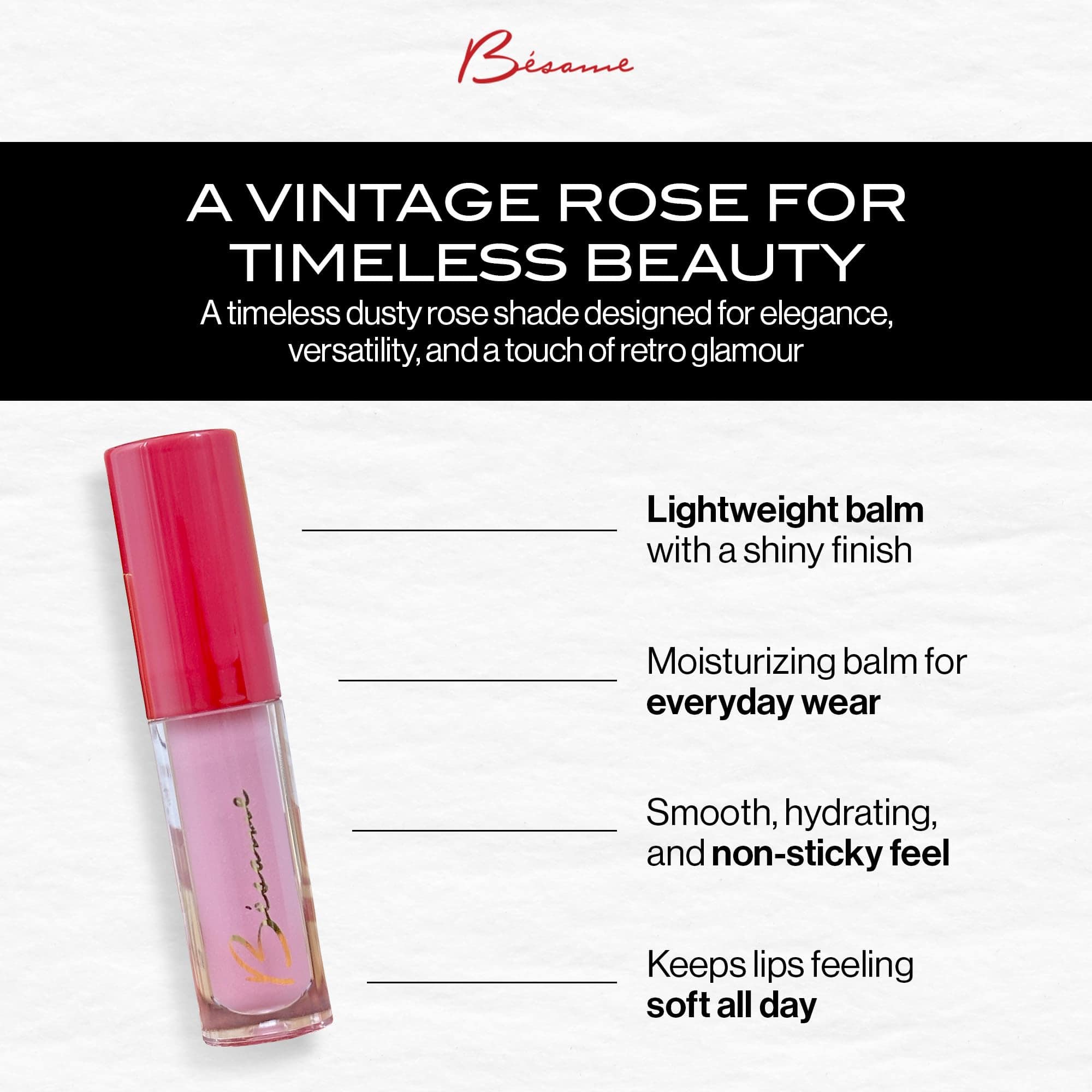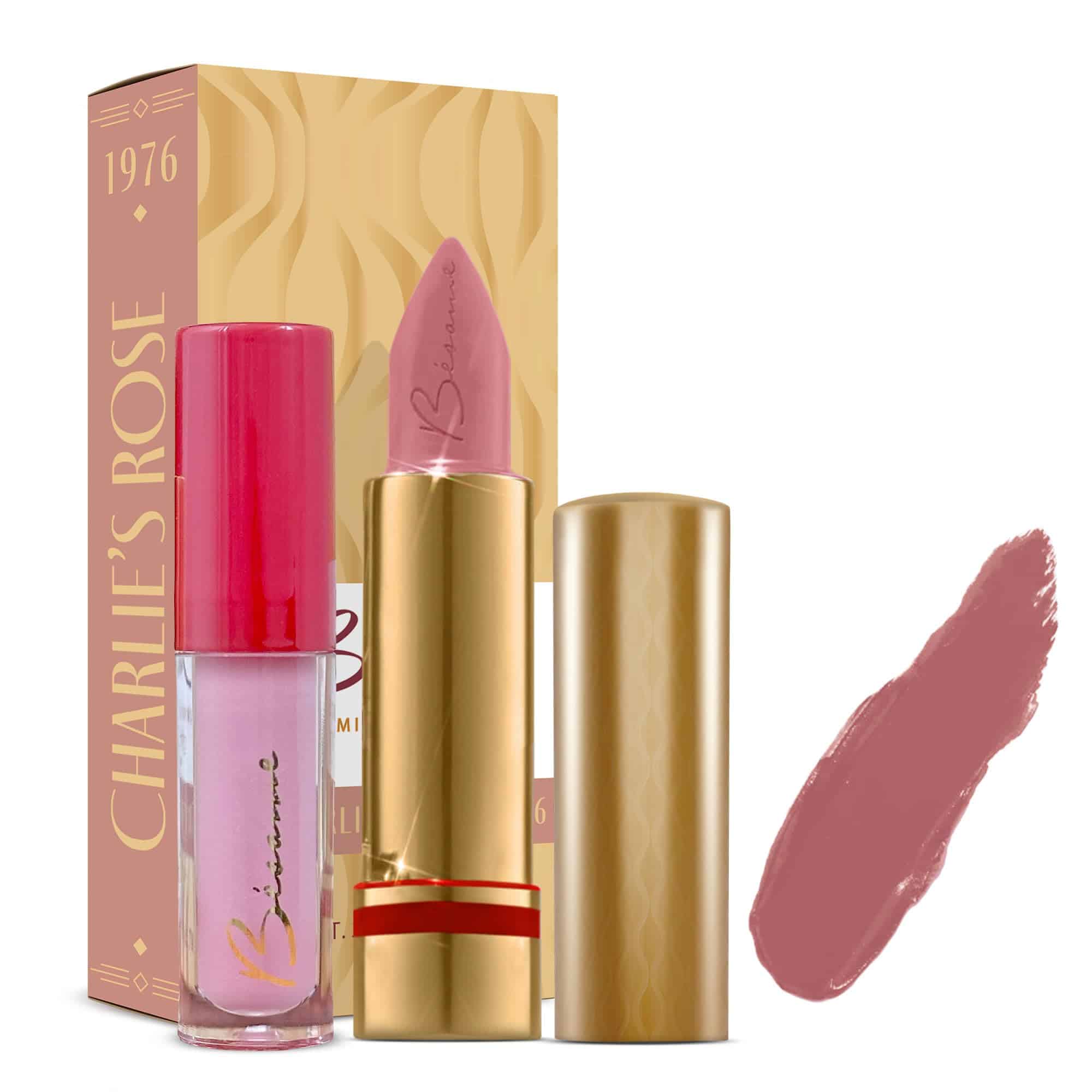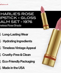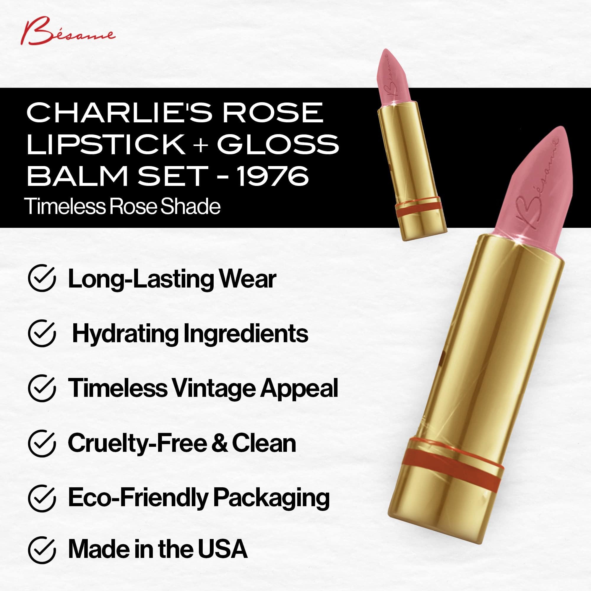 ¡Luce unos labios espectaculares con este set de lápiz labial y bálsamo brillante de BESAME COSMETICS! El lápiz labial Charlie’s Rose agrega un toque de color vibrante y duradero, mientras que el bálsamo brillante proporciona brillo y humectación. Este set es perfecto para recrear el look clásico de 1976. ¡Atrévete a lucir radiante!