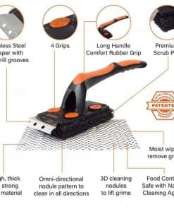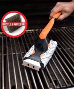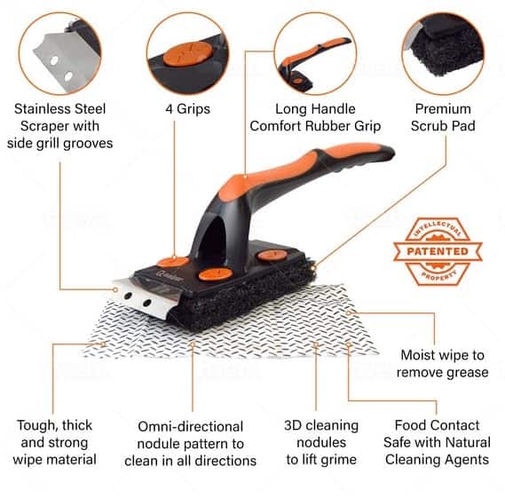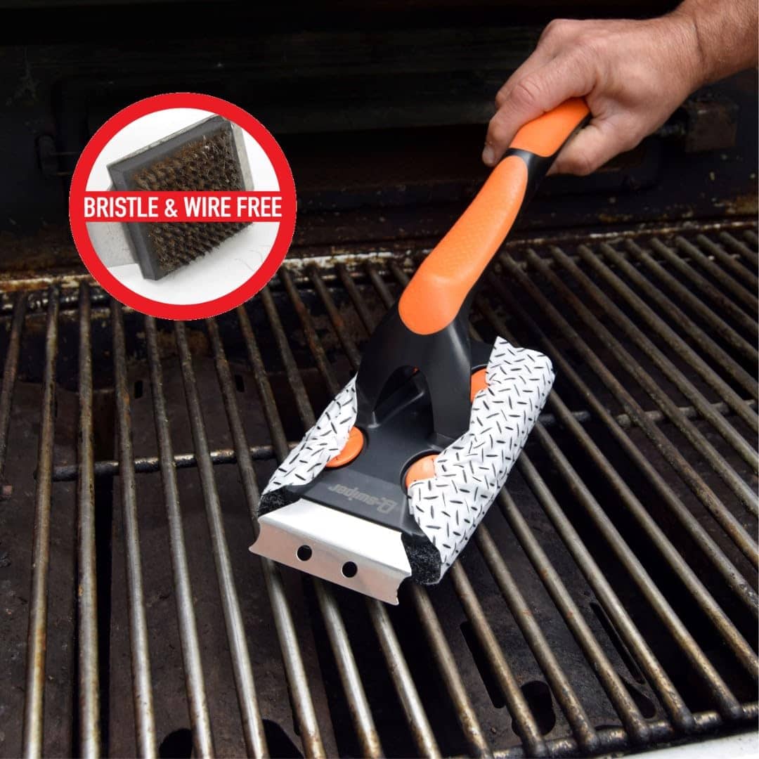 El Set de Limpiador para Parrilla de Barbacoa Q-Swiper XL Easy-Clean hace que sea fácil limpiar las rejillas de la parrilla de tu parrilla de barbacoa o plancha. La húmeda, resistente y segura Toallita de Limpieza para Parrilla de Barbacoa absorbe la grasa de las superficies de la parrilla. Nuestras Toallitas de Limpieza para Parrilla usan ingredientes seguros para el contacto con alimentos y agentes de limpieza naturales. Las toallitas húmedas elimina la grasa y el Cepillo de Parrilla sin cerdas Q-Swiper XL tiene un mango largo, agarres de goma cómodos, orificio para colgar y un Raspador de Parrilla de Acero Inoxidable para eliminar partículas de alimentos quemadas. Cada Toallita Q-Swiper de 6″ por 8″ es reemplazable, por lo que puedes usar una nueva toallita para limpiar las rejillas de la parrilla antes de cocinar. Es un accesorio ideal para parrillas porque dejas de reutilizar un cepillo de limpieza de parrilla sucio o una almohadilla o raspador de madera sucios. Los Nódulos de Limpieza de Parrilla 3D Omni-Directional combinados con potentes agentes de limpieza seguros para el contacto con alimentos ayudan a eliminar la grasa y la suciedad difíciles de las rejillas de la parrilla. Las toallitas de limpieza Q-Swiper son seguras para limpiar todas las superficies de parrillas de parrilla y plancha, incluyendo parrillas de acero inoxidable, parrillas esmaltadas de porcelana y hierro fundido. Adecuado para su uso en todas las principales marcas de parrillas y ahumadoras, incluidas Weber, Blackstone, Broil King, Napoleon y Traeger. Úsalo en una parrilla fría.
