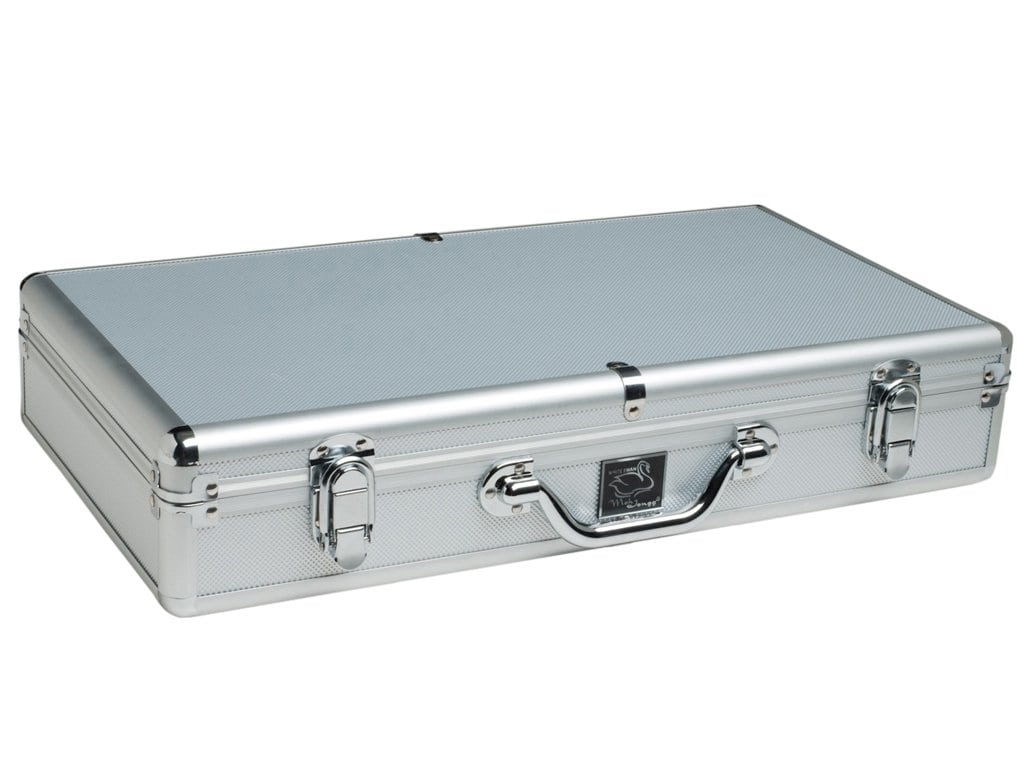 Los sets de Mah Jongg de White Swan vienen en una variedad de hermosos estuches de aluminio de alta calidad que cuentan con asas ergonómicas reforzadas, cierres y bisagras extra fuertes, así como protectores de esquinas bellamente acentuados.