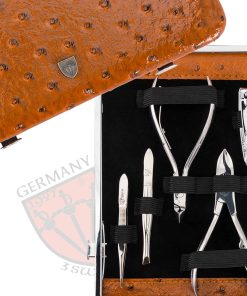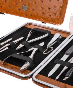 Set de cuidado de uñas de 11 piezas exclusivo para manicura, pedicura y aseo de alta calidad de la marca 3 Swords Germany. Incluye tijeras de cutículas, tijeras para uñas, cortaúñas de cutícula, cortaúñas, pinzas oblicuas, pinzas puntiagudas, lima de uñas de zafiro, cortaúñas, instrumento doble, palillo para cutículas, removedor de puntos negros. Estuche de cuero de moda color marrón avestruz, tamaño aproximado 18,5 x 12,5 x 2,0 cm. Todos los instrumentos de acero son hechos a mano, niquelados brillantes, pulidos y endurecidos. Los estuches vienen en una atractiva caja de regalo de 3 Swords Germany. Garantía de satisfacción: ¡Contáctenos directamente, siempre encontramos una solución! Un set de belleza 3 Swords es un regalo perfecto para mujeres, hombres y es ideal para Navidad, cumpleaños, día de las madres/padres, bodas, acción de gracias y día de San Valentín.