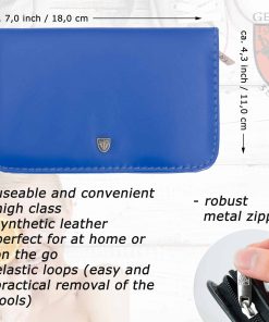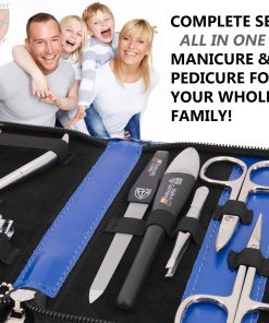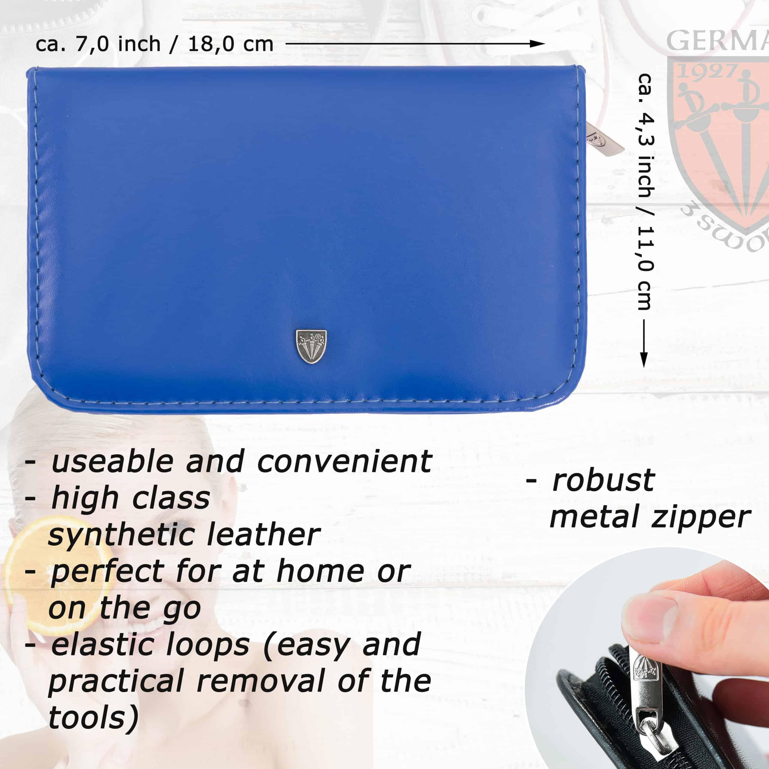 Kit de cuidado de uñas de 3 Swords Germany con herramientas de manicura y pedicura profesionales. Nuestros sets para uso en casa y viajes convencen por los más altos niveles de calidad, diseño moderno, durabilidad e ingeniería alemana combinada con un servicio al cliente de primera clase. Contenido: Tijeras de cutícula, tijeras de uñas, cortaúñas de cutícula, cortaúñas de uñas, pinzas, lima de uñas de zafiro, doble instrumento, removedor de cutícula, cortauñas de dedo, cortauñas de pie, palillo de pezuña. Implementos de acero: Hecho a mano, niquelado brillante (protección contra la corrosión), pulido y endurecido. Todos los estuches vienen en una atractiva caja de regalo. Los instrumentos son fabricados por 3 Swords desde 1927. Estuche: Cuero de moda azul, tamaño aprox. 18,0 x 11,0 x 2,5 cm. Nuestros organizadores están hechos de materiales de moda de alta calidad. Equipamiento adicional: Paño de limpieza de microfibra para limpiar artículos de acero, hoja de información general sobre el cuidado de uñas. ¡GARANTÍA DE SATISFACCIÓN: Por favor, CONTÁCTENOS DIRECTAMENTE, SIEMPRE encontramos una solución! ¡Un set de belleza 3 Swords es un regalo perfecto para mujeres, chicas y hombres, y es ideal para Navidad, cumpleaños, Día de la Madre / Padre, matrimonio, acción de gracias y día de San Valentín!