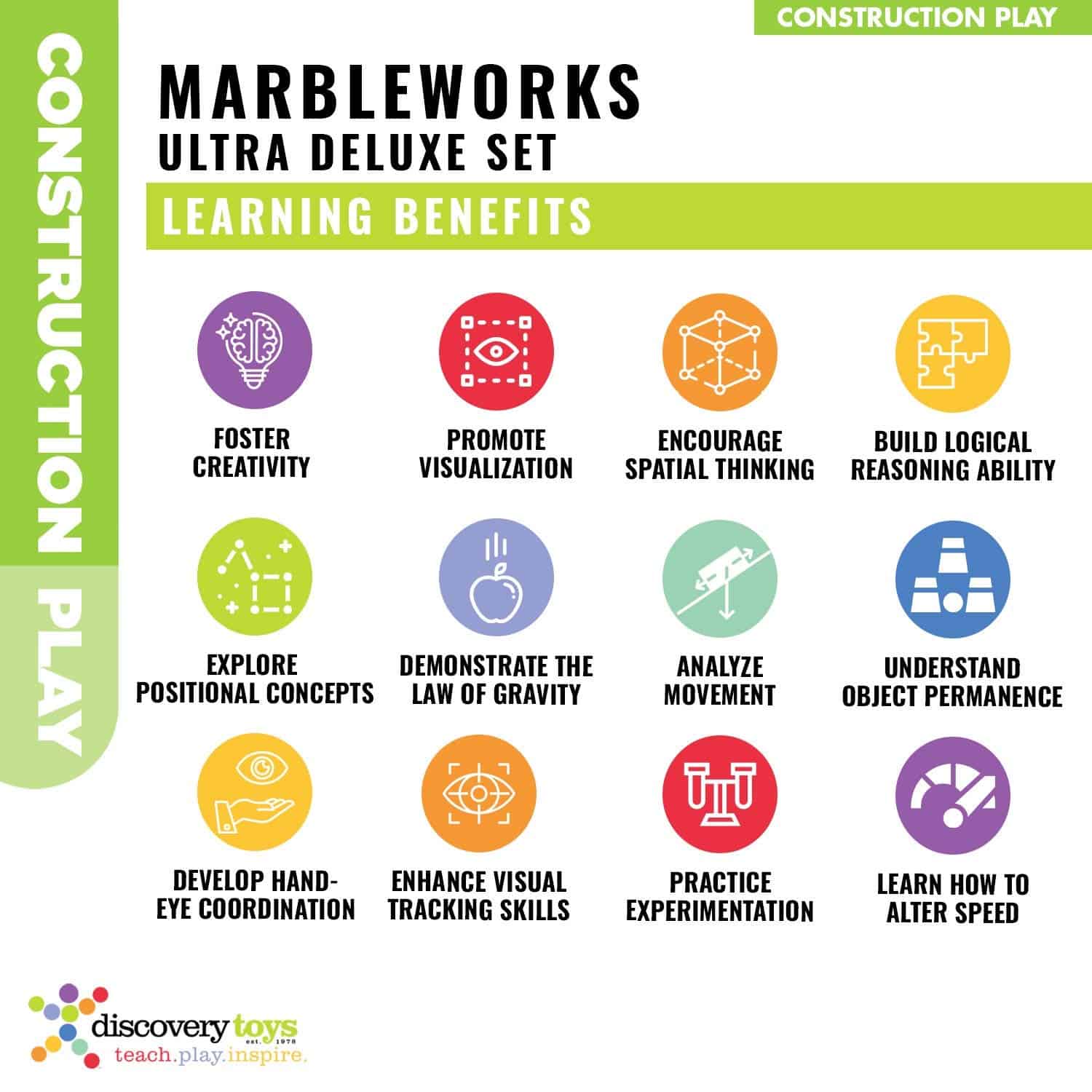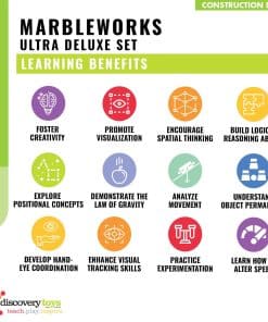 Conecta tubos, toboganes y bases de colores juntos de diferentes maneras para crear un número infinito de configuraciones de pista de carreras. A medida que las canicas se deslizan por el curso, los niños aprenden sobre las leyes de la física, la gravedad, la permanencia de los objetos y la causa y efecto. Los galardonados productos de Marbleworks Marble Run inspiran a niñas y niños a seguir una educación superior en los campos STEM de ingeniería, matemáticas y tecnología. Hecho de poliestireno de alto impacto, que es duradero, resistente a los impactos y produce un aspecto brillante agradable. Los colores pueden variar. Libre de BPA. Incluye: Puerta de inicio Puerta de llegada 2 rampas estándar Rampas de parachoques 2 Rampas de rueda de paletas 2 Rampas de embudo 2 Rampas de serpiente 2 Rampas de laberinto Pista dividida Tobogán de salto Tobogán de aterrizaje Rampa de triple bobina 2 Soportes de rampa de triple bobina 10 Bases 85 Postes 26 Canicas a partir de 5 años Beneficios Fomenta la creatividad y experimentación. Promueve la visualización, habilidades de pensamiento espacial y capacidad de razonamiento lógico. Comprende el concepto de permanencia de los objetos, ya que las canicas viajan dentro y fuera de los tubos. Desarrolla la coordinación mano-ojo y las habilidades de seguimiento visual. Premios 100 Mejores Juguetes Clásicos de Dr. Toy 100 Mejores Juguetes de Dr. Toy Los Favoritos de los Padres de Scholastic Elección de los Maestros