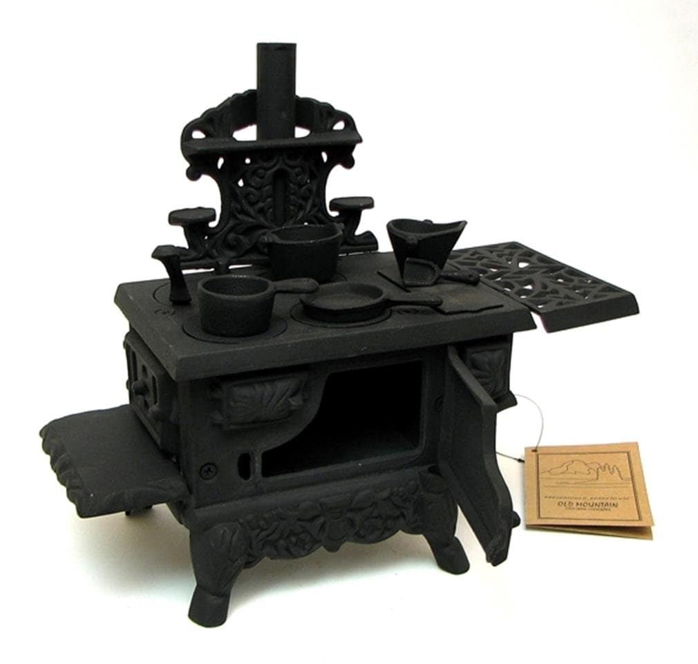 Esta mini estufa de cocina de hierro fundido Old Mountain es de color negro y una réplica exacta de las estufas de cocina de antaño. Esta estufa de cocina de madera Old Mountain viene completa con tubo de estufa y soporte trasero, dos estantes laterales, tapas de quemadores, un cubo y pala de carbón, una olla, sartén y sartén. Esta estufa mide 12″ de largo, x 10 1/2″ de alto x 5 1/2″ de ancho.