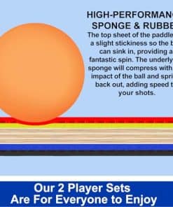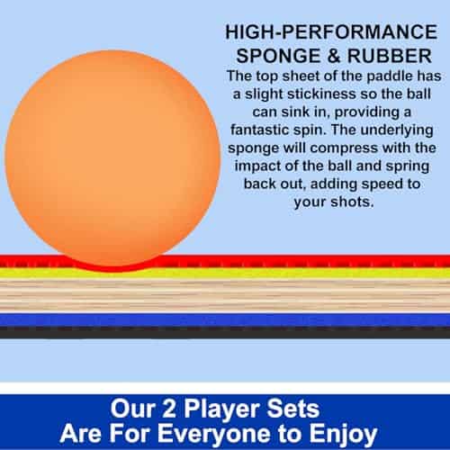 1. ESPONJA Y GOMA DE ALTO RENDIMIENTO – las capas superiores de cada pala tienen un ligero pegamento para que la pelota se hunda, proporcionando un fantástico giro. La capa de esponja subyacente se comprimirá con el impacto de la pelota y volverá a salir como un trampolín, agregando velocidad a tus tiros.