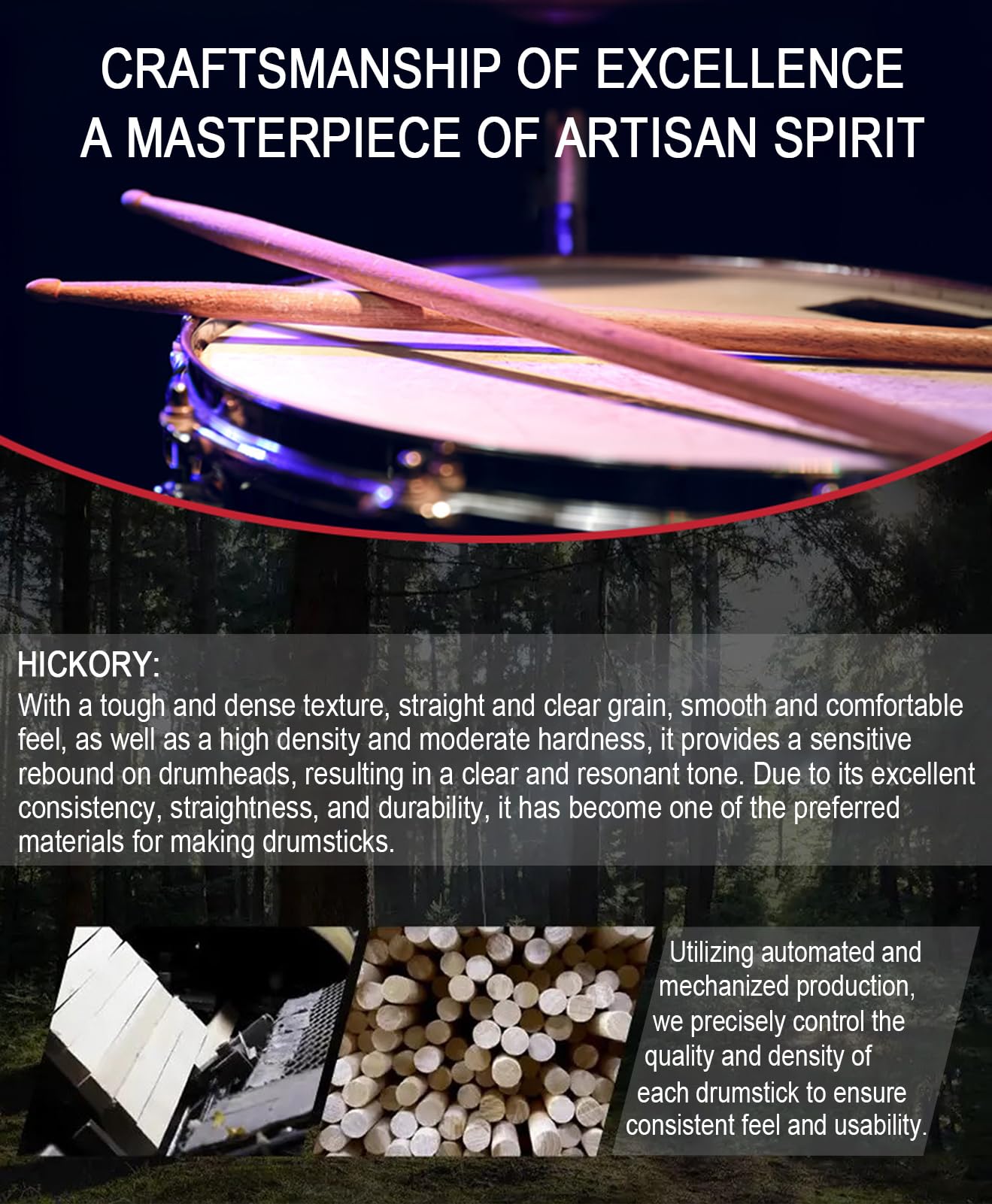 La madera de hickory es conocida por su dureza superior, rectitud, durabilidad y cualidades sónicas, y nuestros palillos de tambor REEKY están fabricados con esta madera de alta gama, siguiendo estrictos estándares para asegurar un sonido puro y una larga vida útil durante tus actuaciones. El agarre cómodo reduce la fatiga de la muñeca, permitiéndote concentrarte más en tu interpretación.