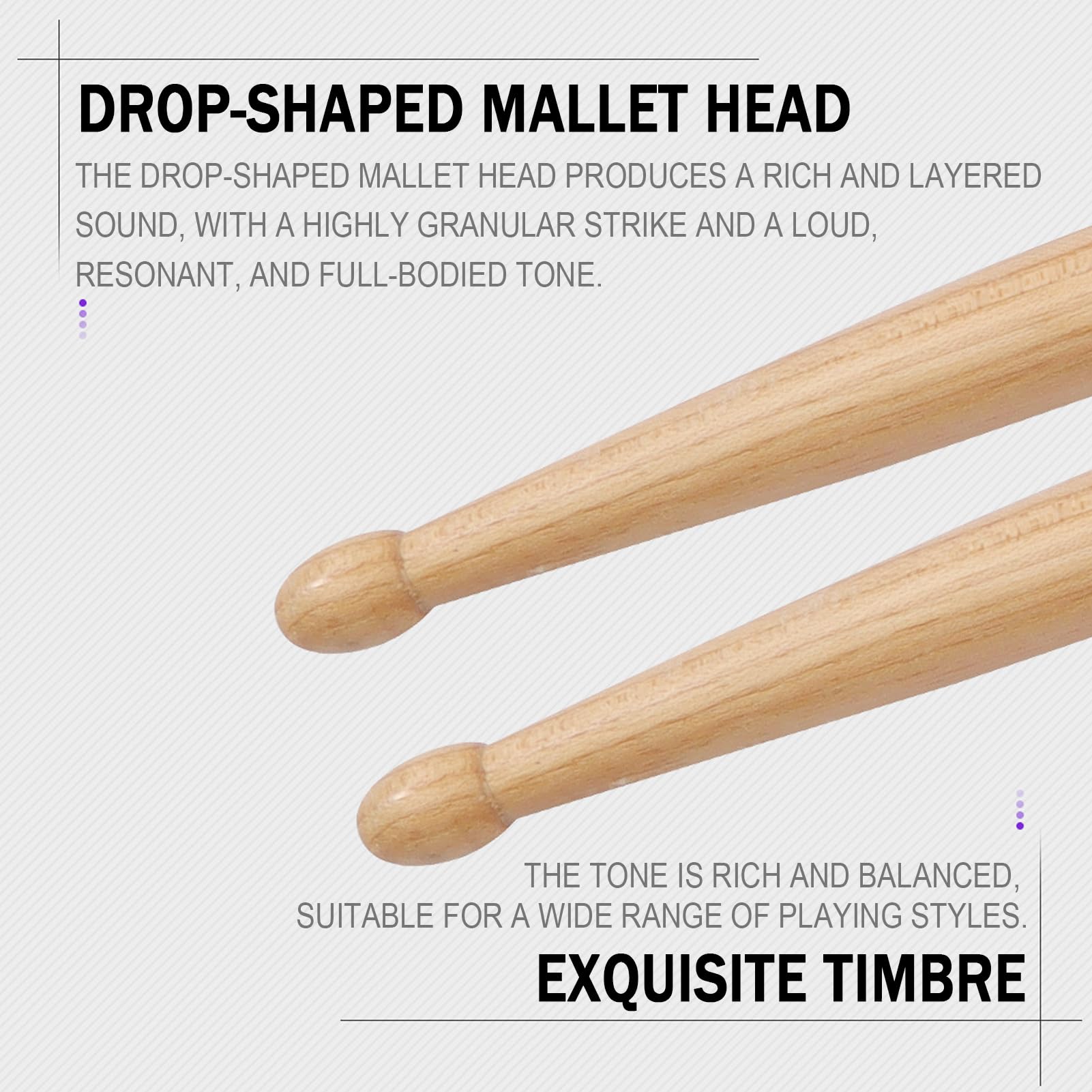 Las puntas en forma de lágrima de los palillos de tambor ayudan a proporcionar un tono equilibrado y una articulación nítida, permitiendo que tus tambores y platillos produzcan sonidos ricos y completos, ya sea golpeando suavemente o con fuerza. Son adecuados para todos los bateristas, desde principiantes hasta intérpretes profesionales, y son fáciles de manejar.