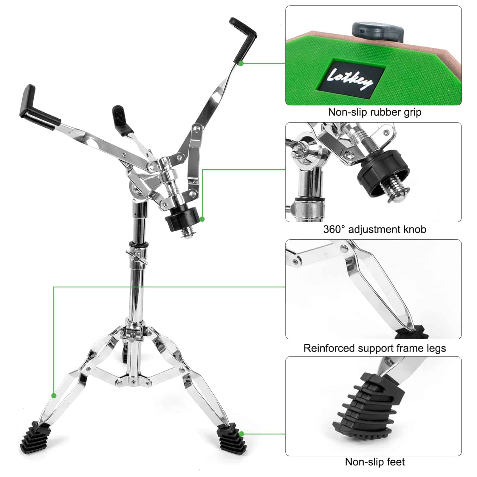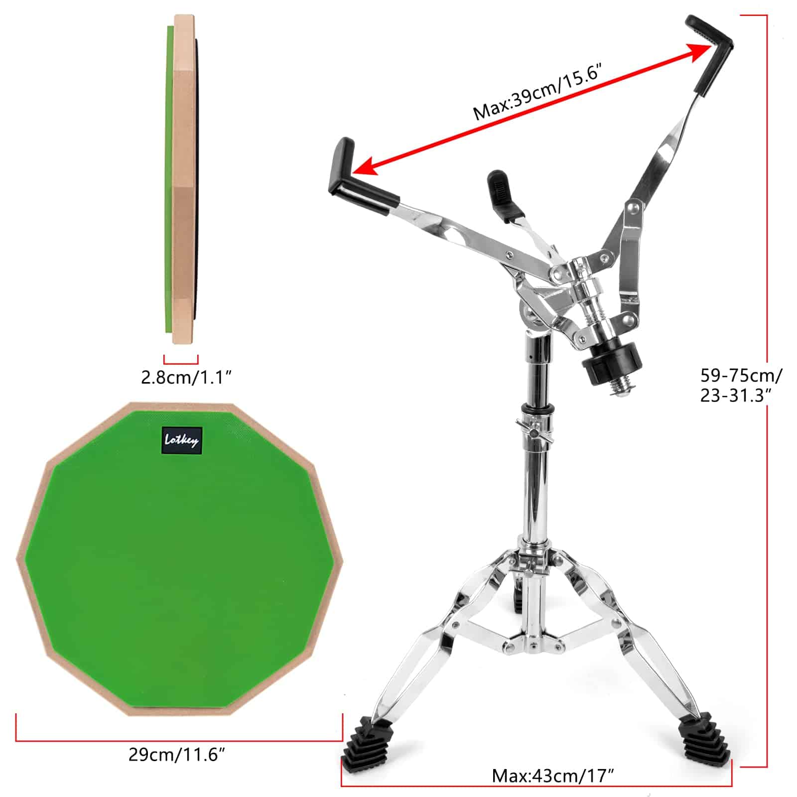 El set de parches de práctica de tambor de Lotkey incluye un parche de tambor de 12» con doble cara, un resistente soporte de caja de tambor, una mochila especial portátil, 2 pares de baquetas, un estuche de baquetas y gel de tambor. El parche de tambor está hecho de gel de sílice de alta densidad y elasticidad en la superficie y una base de alfombrilla de polímero EVA con tablero de madera comprimida de alta densidad en la parte inferior, asegurando una sensación de golpear un tambor real y proporcionando una base estable para la práctica. El soporte de caja de tambor es de alta calidad, con diseño resistente de trípodes de doble refuerzo y una canasta ajustable que se adapta a cajas de tambor de 10″-14″ de diámetro. La mochila especial está diseñada para transportar todos los elementos necesarios para el entrenamiento con parches de tambor, hecha de tela Oxford de alta densidad 600Dx600D y esponja gruesa para mayor comodidad en el entrenamiento al aire libre. Además, el set incluye 2 pares de baquetas para evitar daños durante el entrenamiento, un estuche para almacenar las baquetas y gel de tambor para su uso en tambores reales. Con la garantía de devolución de dinero incondicional de 30 días, respaldada por nuestro excelente soporte al cliente, puede comprar nuestros productos con total confianza.