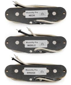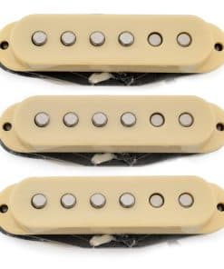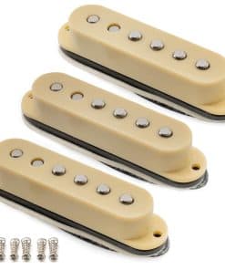 Set de Pastillas de Alnico 5 Staggered de Musiclily Pro ST-50S para Guitarra Eléctrica Estilo Strat, en color crema. Este set de pastillas está diseñado para adaptarse a guitarras eléctricas estilo Strat y proporcionar tonos vintage similares a las pastillas F Custom ’54 Strat. Con polos escalonados para una salida balanceada y una pastilla central con polaridad invertida para cancelación de ruido, estos pickups ofrecen una dinámica mejorada y tonos clásicos de campana. Fabricados con imanes de Alnico 5 y una bobina y placa base de fibra, este set de pastillas incluye un set completo para mástil, centro y puente, junto con los accesorios de montaje necesarios. Nota: Los tornillos incluidos pueden no ajustarse a tu guitarra, por lo que te recomendamos utilizar tus propios tornillos si es posible.