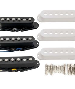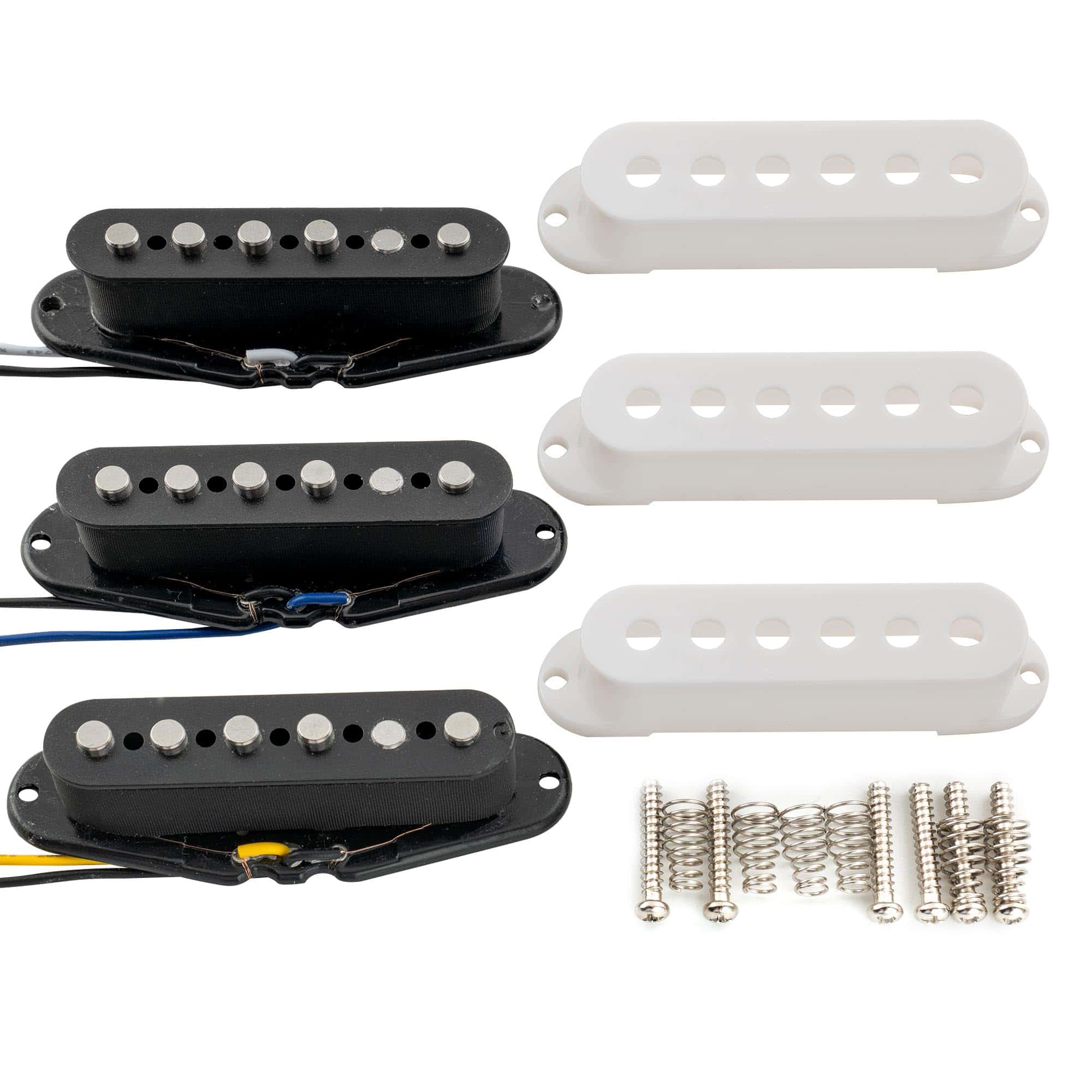 Set de pastillas de cuello, medio y puente para guitarra eléctrica estilo Strat, adecuado para posición de cuello/medio/puente. Imán escalonado de Alnico 5, tonos estilo vintage, similar a las pastillas F Custom 69 Strat, con piezas de polo escalonadas para una salida equilibrada, pastilla intermedia con polaridad inversa para cancelación de ruido, produce agudos claros y graves profundos, funciona especialmente bien con pedales permitiendo que los graves golpeen y los agudos se eleven. Recomendado para Blues, Rock, Classic Rock. Espaciado de polos: el cuello y medio es de 50mm, el puente es de 52mm, distancia entre agujeros de tornillo de montaje: 76.5mm. Resistencia (cuello/medio/puente): 5.6K/5.6K/6.8K, inductancia (cuello/medio/puente): 2.2H/2.2H/3.0H. Tolerancia: 0.5K para bobina simple, 1K para humbucker. El valor de resistencia cambiará según la temperatura y la humedad. Por lo general, el valor de resistencia será alto en clima cálido y seco, bajo en clima frío y húmedo. En casos extremos, la tolerancia del valor de resistencia será mayor. Imán: Alnico 5; bobina y baseplate de plástico ABS; cableado: PVC 2P. Incluye: set de pastillas de cuello, medio y puente y accesorios de montaje. Nota: Nuestros tornillos pueden que no se adapten a su uso, utilice los suyos si es posible.